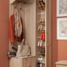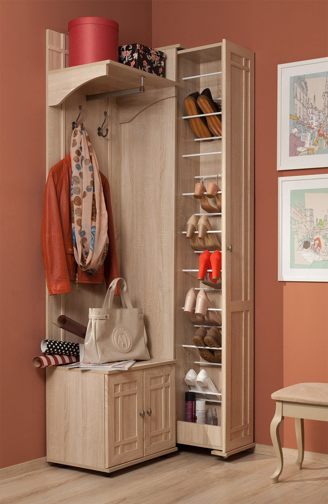 - Angolo. Un piccolo armadietto situato nell'angolo occupa poco spazio e può essere utilizzato per riporre sia i capispalla che le scarpe. La scelta per il design del corridoio è una struttura fino al soffitto.
