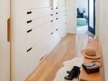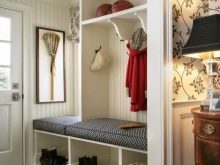 Se c'è spazio libero nel corridoio dopo aver installato l'armadio, è possibile posizionare una piccola panca o un armadio con un'area salotto. Di solito viene utilizzato per indossare le scarpe in un ambiente confortevole, senza appoggiarsi alle pareti.