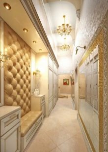 Per decorare questo corridoio vengono utilizzate solo tonalità chiare. Questo lo fa sembrare molto accogliente. La stanza è visivamente divisa in due parti. L'area di passaggio è decorata in bianco. Per evitare che la stanza sembri troppo noiosa, le pareti sono decorate con dipinti ordinati e carte da parati fotografiche.