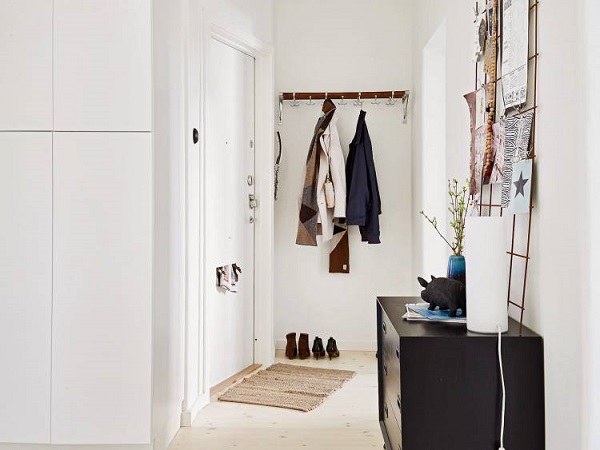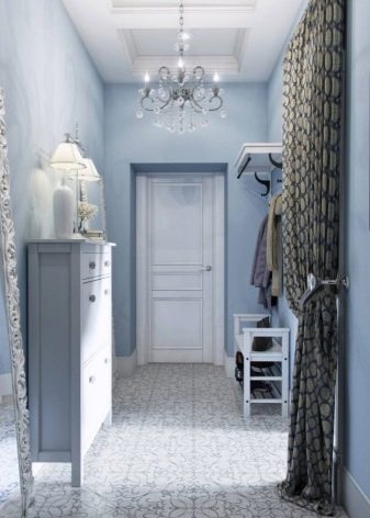 - Usa sfumature chiare. Il bianco è riflettente. Pertanto, se lo scegli per la decorazione di pareti, pavimenti o soffitti, la stanza sembrerà più spaziosa. In modo che la stanza non sembri sterile, vengono utilizzati ulteriori dettagli decorativi. Ad esempio, un supporto in metallo con decorazioni dorate per scarpe o capispalla.