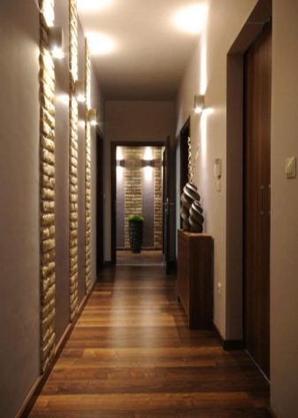Anche la scelta dei dispositivi di illuminazione gioca un ruolo importante nella progettazione del corridoio. Non dovrebbero essere troppo ingombranti e massicci. Per un corridoio stretto, vale la pena scegliere lampade in miniatura e potenti. Saranno in grado di illuminare completamente la stanza.