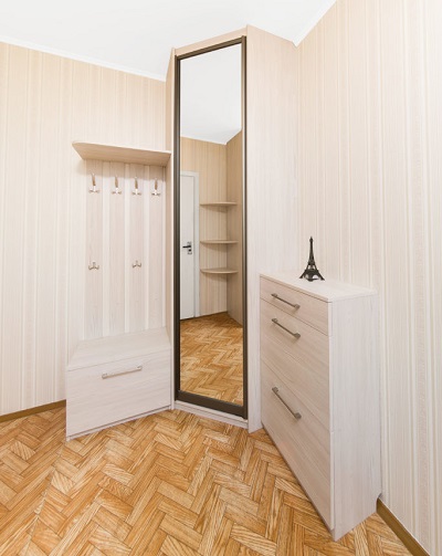 In una stanza stretta, un armadio con ante a specchio sembra buono. Installandolo all'interno, puoi dimenticare la necessità di acquistare uno specchio nella stanza.
