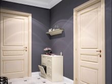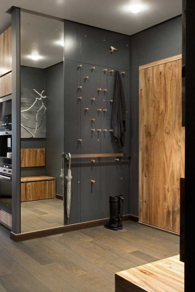 Le pareti scure sembrano buone in contrasto con il legno chiaro. Tali mobili conferiscono al corridoio un grado di serenità e coerenza.
