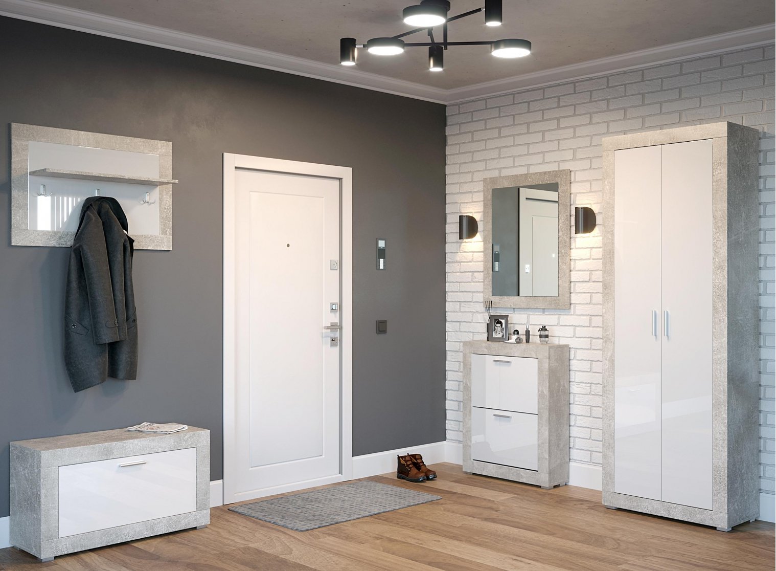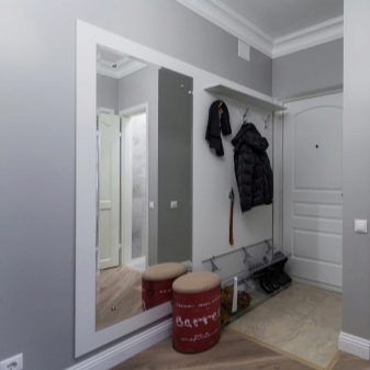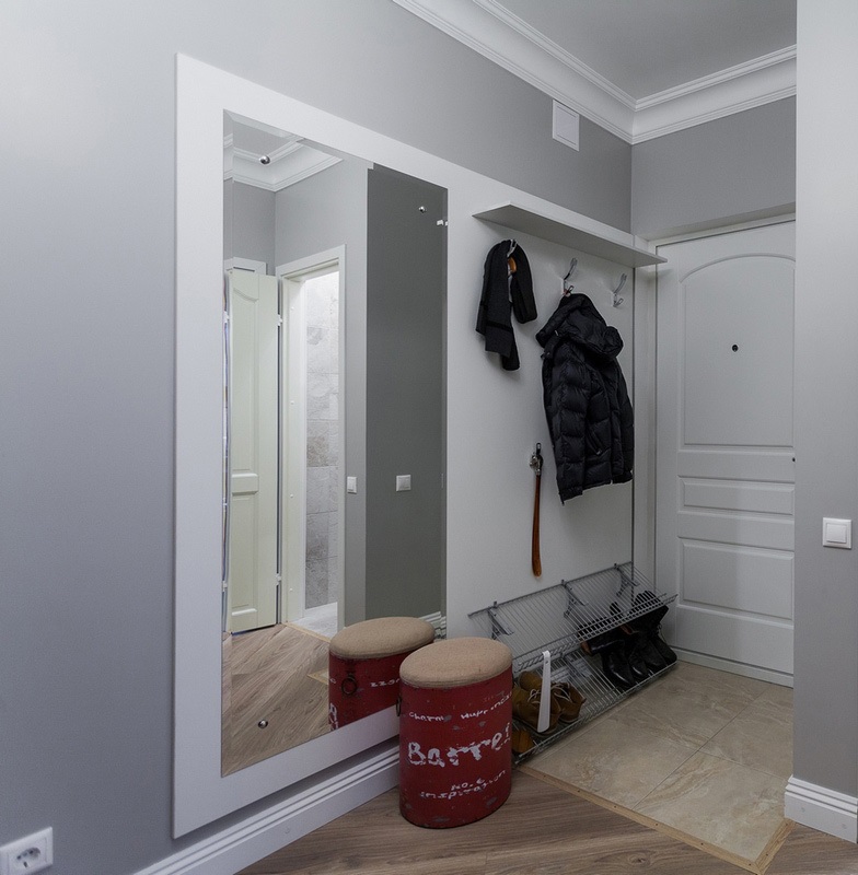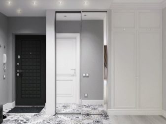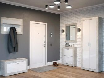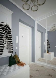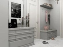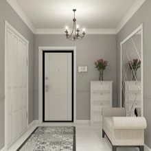 I mobili di una tonalità più chiara o bianca stanno benissimo su uno sfondo grigio. Particolarmente importante per piccoli corridoi con scarsa illuminazione. In questo caso, si consiglia di utilizzare elementi lucidi, cromati e a specchio in modo che non solo espandano visivamente lo spazio, ma riflettano anche la scarsa illuminazione.
