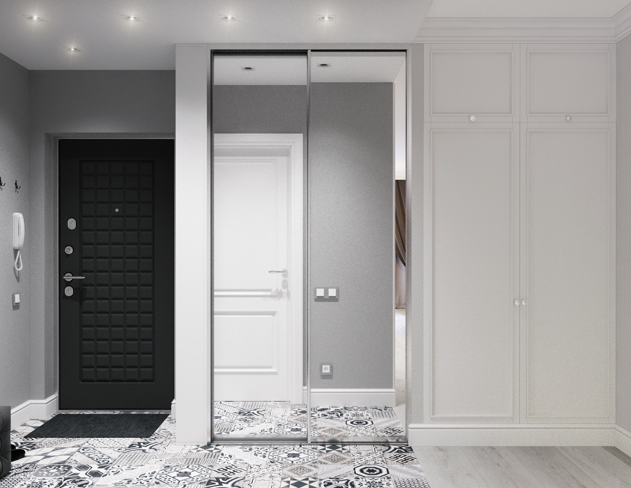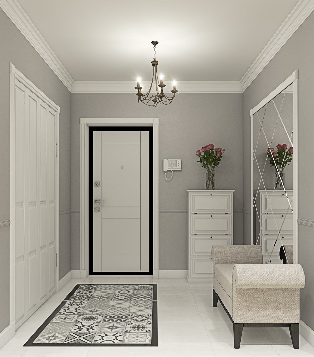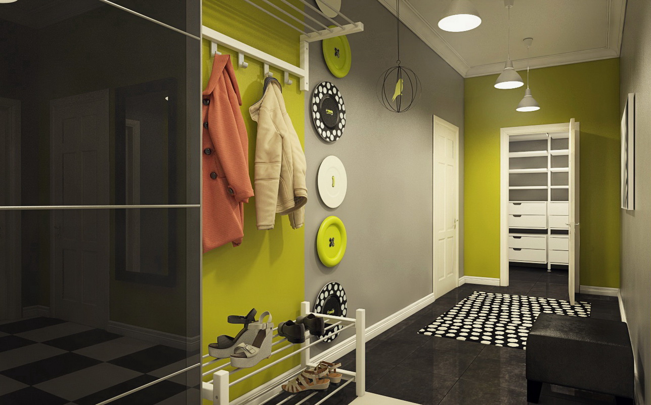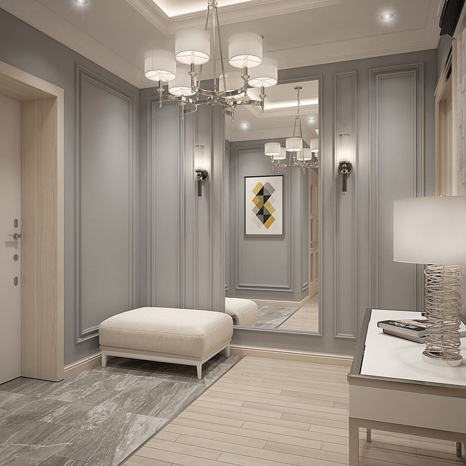 - sfumature di grigio chiare e contrastanti espandono lo spazio, rendendolo ideale per corridoi stretti e piccoli corridoi.
