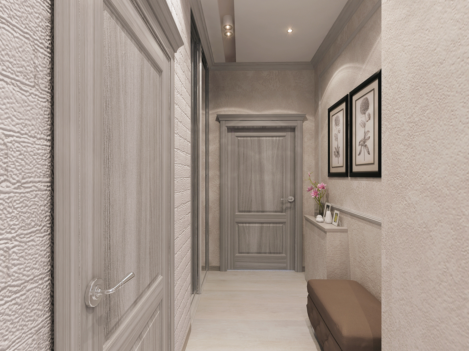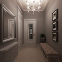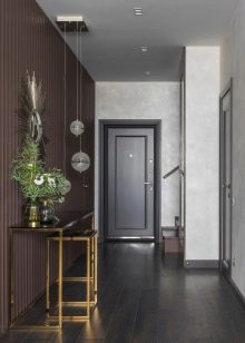Un corridoio nei toni del grigio si sposa bene con il marrone. Porte interne e mobili si adattano particolarmente bene; puoi anche aggiungere elementi in ferro battuto.