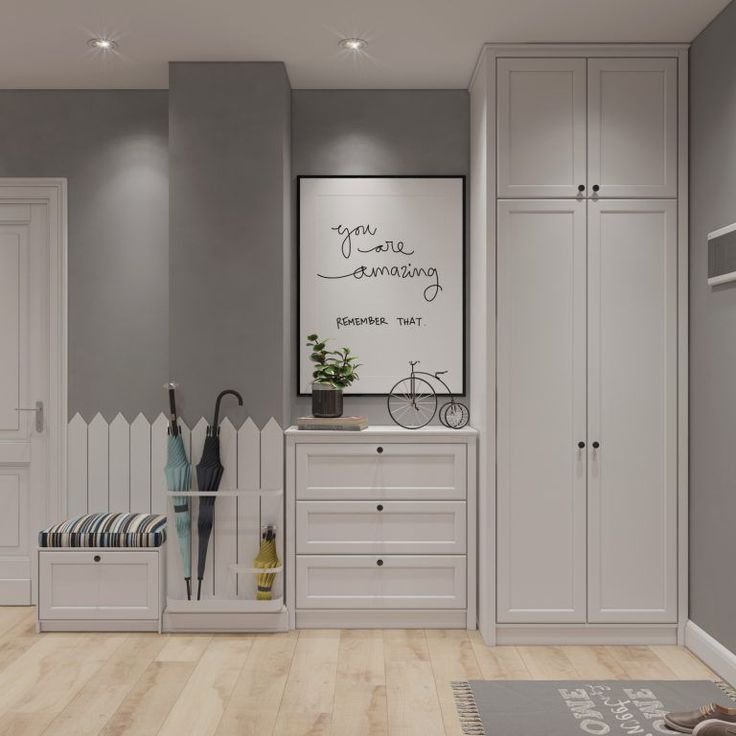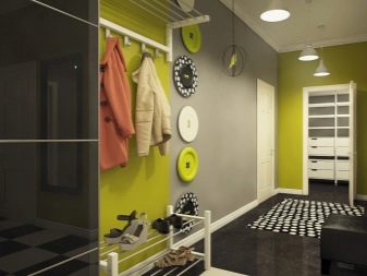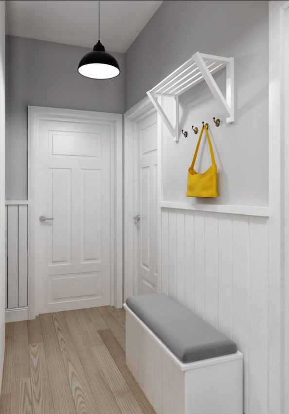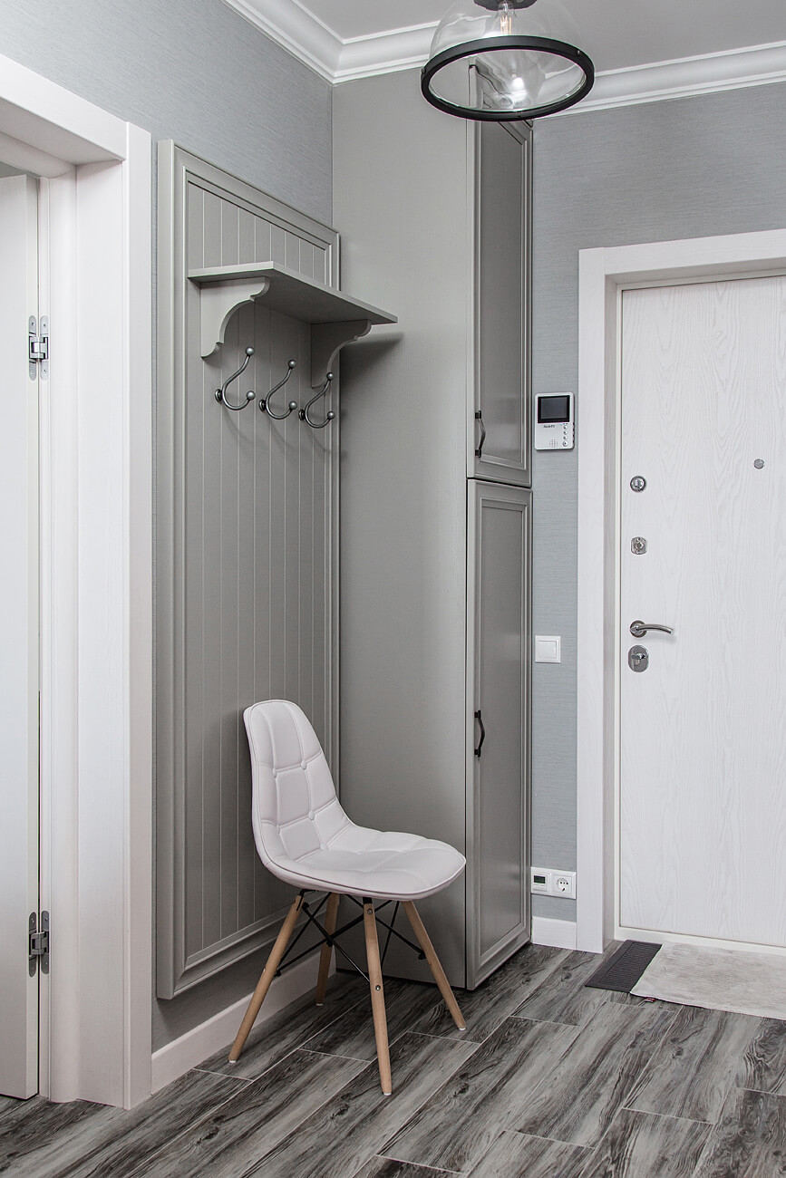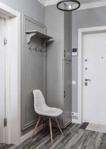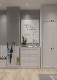 A causa del fatto che le pareti, il pavimento, il soffitto, la porta d'ingresso e persino l'immagine hanno diverse tonalità di grigio, l'interno sembra semplice, ma armonioso e per nulla noioso. È diluito con macchie bianche a forma di orologio, scarpiera e porta interna. L'armadio a muro si adatta in modo molto armonioso. Non solo non attira l'attenzione su di sé, ma espande perfettamente anche lo spazio.