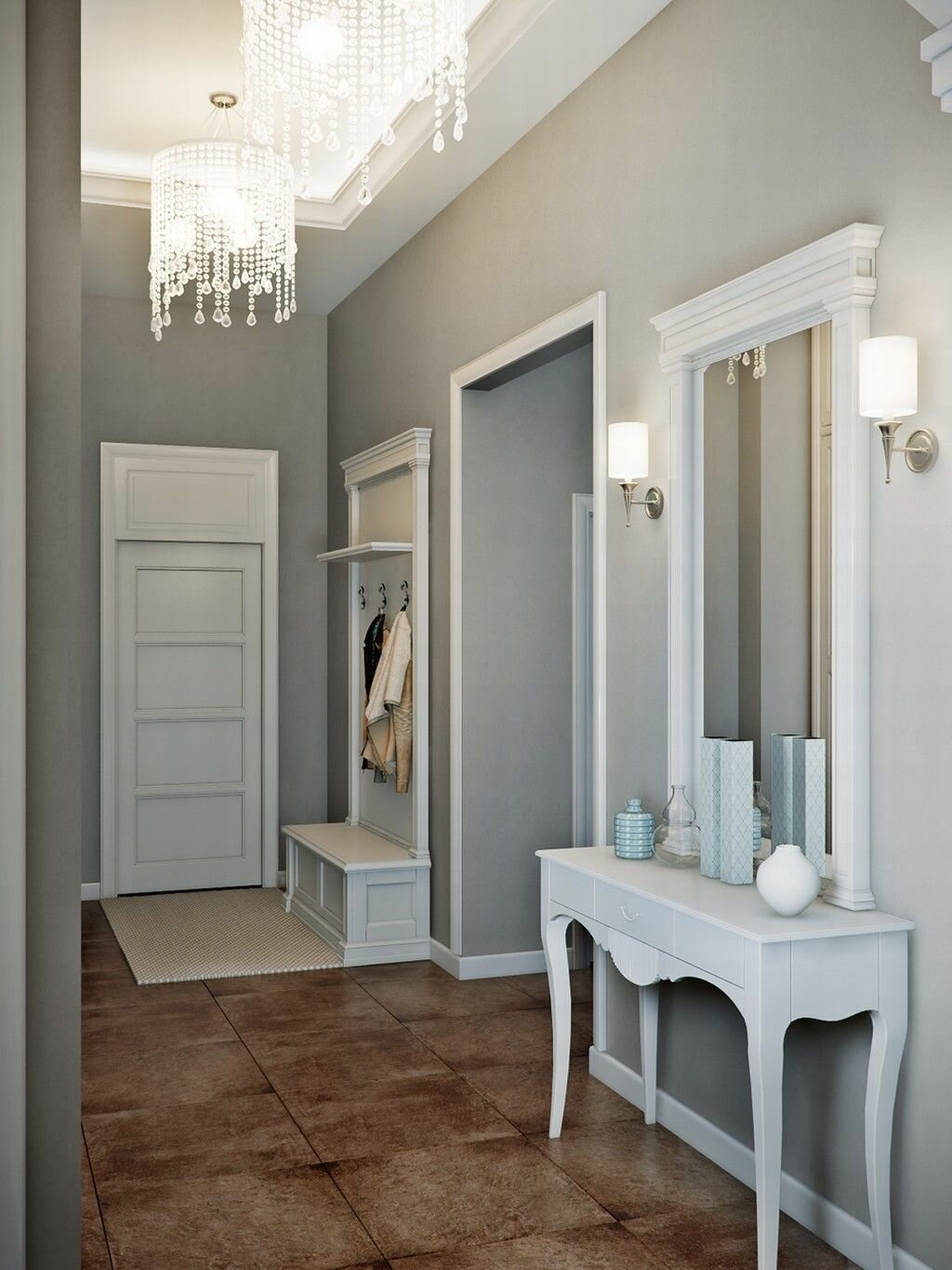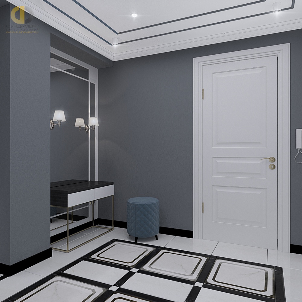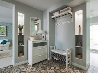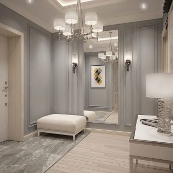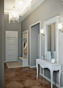 - l'atrio, progettato in grigio, collega perfettamente stanze decorate in diverse direzioni stilistiche, ed è esso stesso eccellente per l'eclettismo;