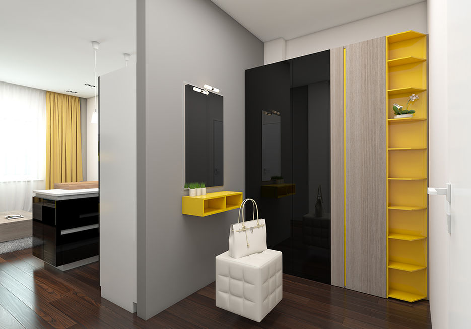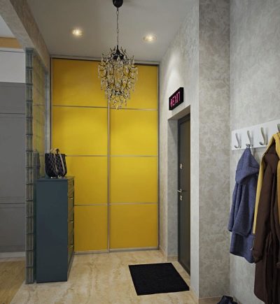 L'interno di un corridoio grigio e calmo è diluito con porte gialle luminose di un armadio a muro. Sembra che il sole abbia fatto capolino in questo angolo dell'appartamento.