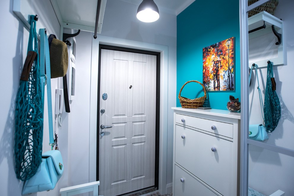 Il corridoio turchese sembra più ottimista e festoso. Allo stesso tempo, il grigio si attenua leggermente, rendendo il design più calmo. Perfettamente realizzato in stile mediterraneo o nautico.