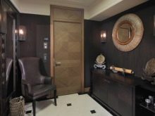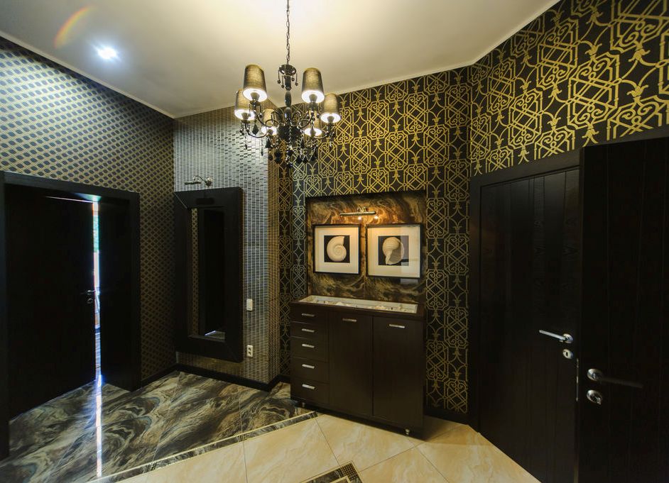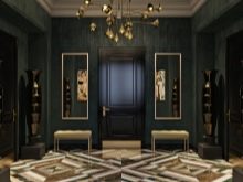 - Per un interno in stile Art Déco, ti consigliamo di prendere in considerazione un pavimento in marmo scuro e rivestimenti murali combinati. L'abbondanza di superfici lucide e in pelle in un tale corridoio enfatizzerà sicuramente questo design.