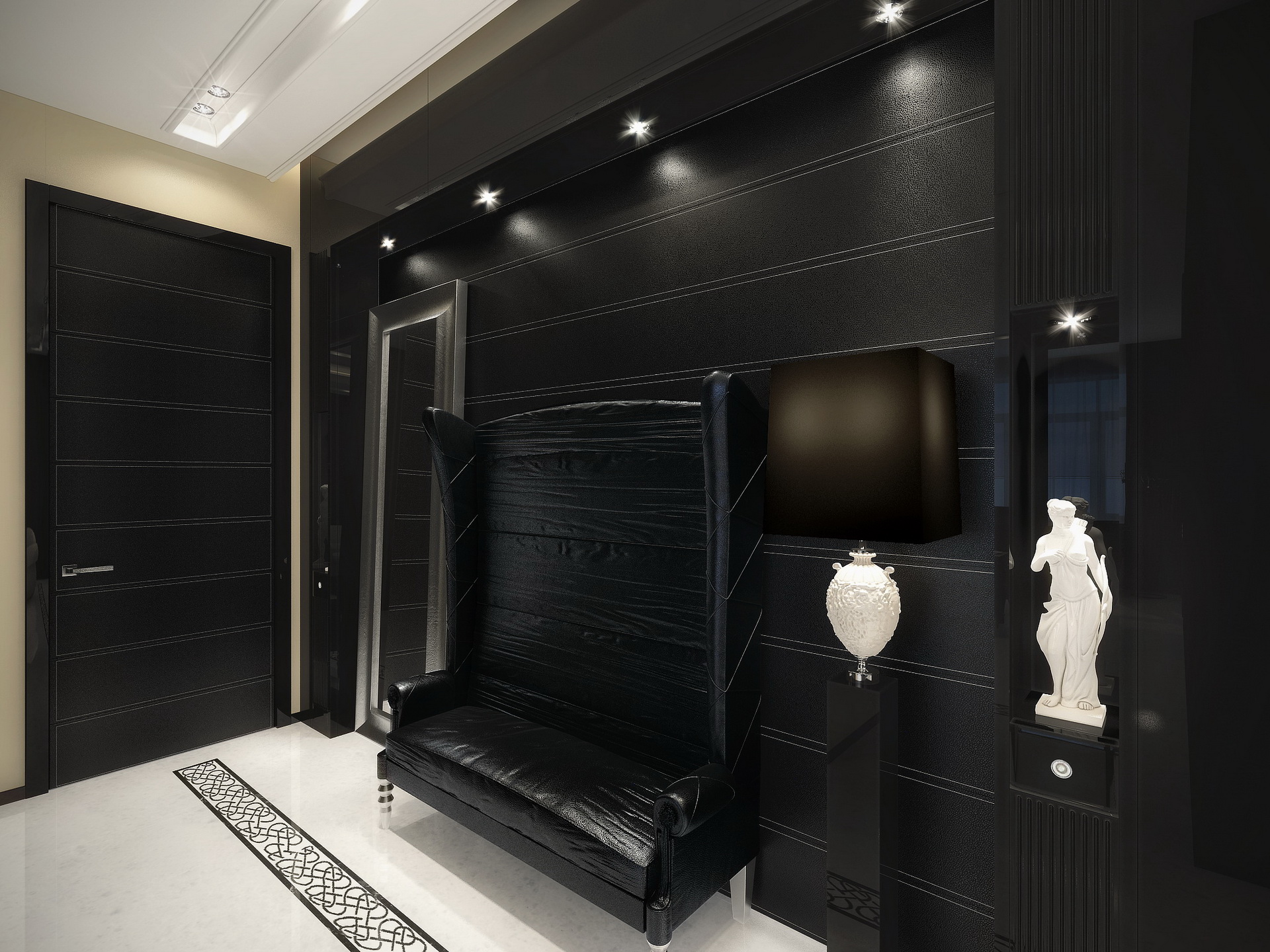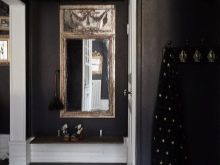 - In un corridoio moderno, puoi realizzare pareti nere opache e allo stesso tempo scegliere il pavimento in modo che assomigli al legno naturale. Come rivestimento per pavimenti, puoi utilizzare il parquet o il suo analogo più vantaggioso: il laminato. Le pareti nere in un tale interno possono essere in buona armonia con il soffitto bianco, così come la porta d'ingresso nera.