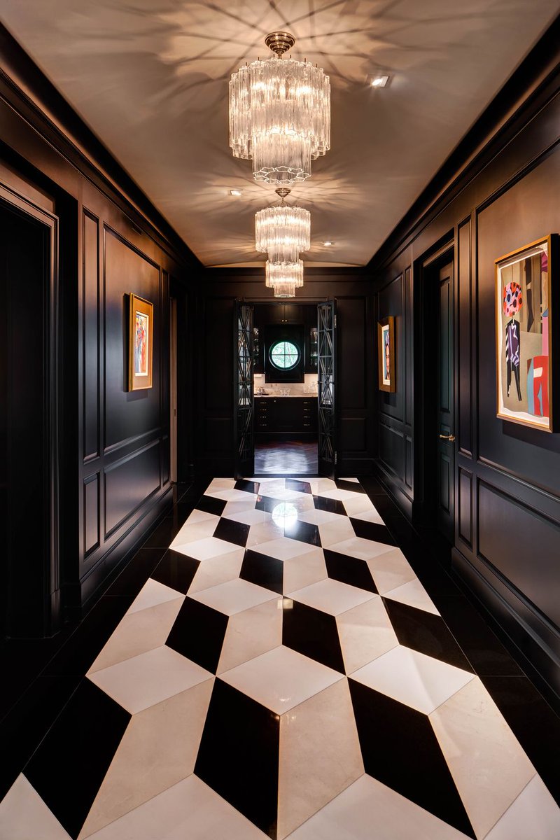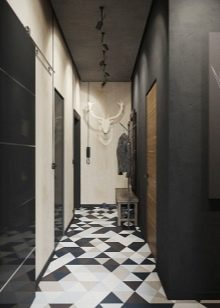 Un lungo corridoio con pareti scure e un pavimento con un motivo a forma di rombi a contrasto sembra squisito. Allo stesso tempo, due lampadari di medie dimensioni sono posizionati sul soffitto chiaro, sottolineando l'unicità di questo interno.