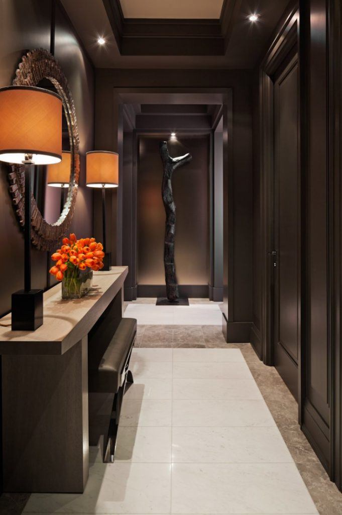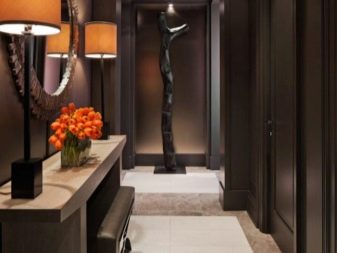 All'interno di un corridoio buio, puoi posizionare un tavolo stretto e uno specchio sul muro in una cornice insolita. Allo stesso tempo, le pareti di cioccolato fondente sono in ottima armonia con il pavimento bianco e beige, così come il soffitto a due livelli. Due lampade da tavolo aggiungono intimità e calore speciali alla stanza.
