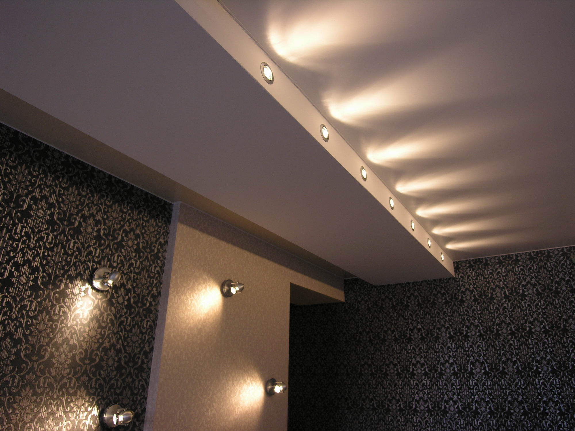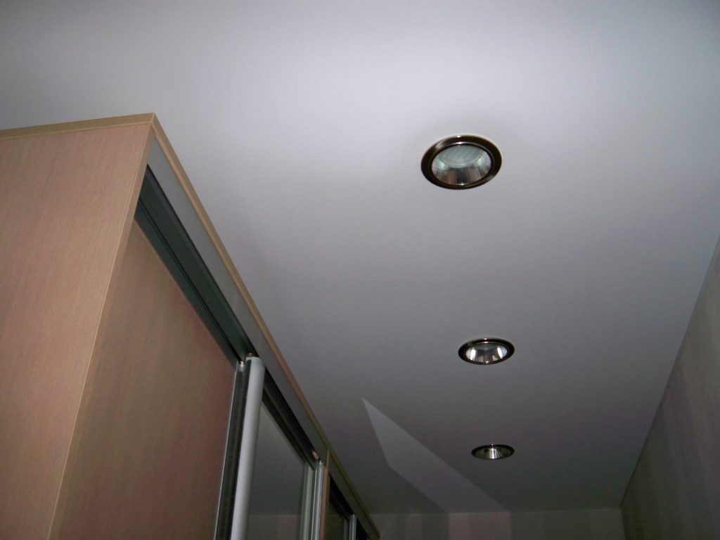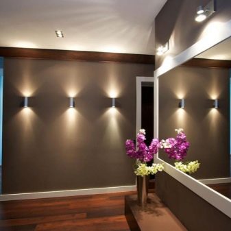 Qualsiasi stanza troppo buia e priva di luce naturale può sempre essere corretta con successo con la luce artificiale. Oggi, il più popolare è l'installazione di un soffitto teso con illuminazione spot e, a seconda della trama, può essere installato sia in interni moderni che classici. Ma le lampade integrate aiuteranno a enfatizzare lo stile stesso, sono disponibili in una varietà di forme. Gli elementi luminosi su un soffitto teso possono essere posizionati attorno al perimetro, tutto dipende dall'area del corridoio.