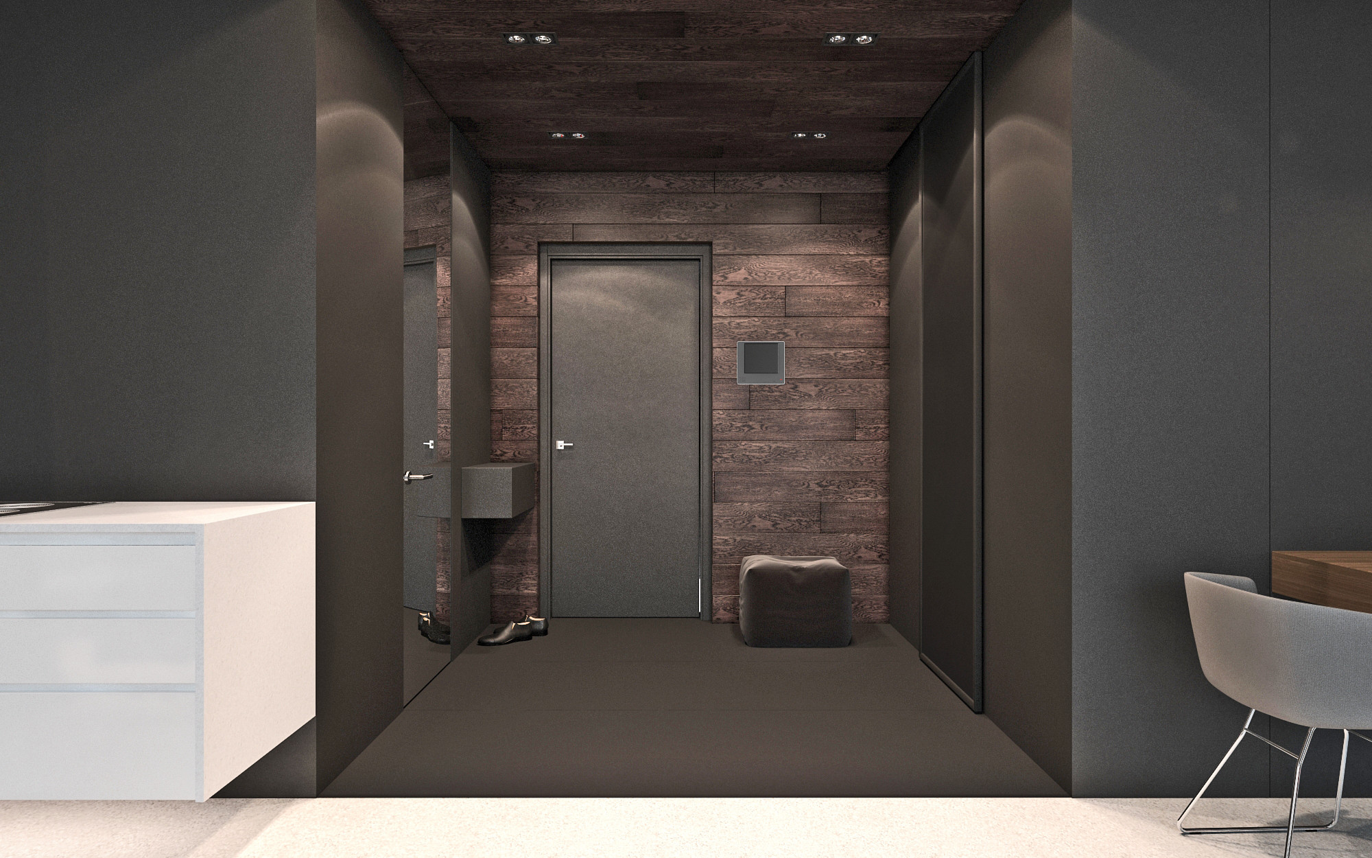 Un corridoio moderno sembra molto vantaggioso, le cui pareti sono dipinte in grigio scuro e il pavimento è scelto nel colore del legno scuro naturale. Particolari accenti nella stanza sono il soffitto, così come una lampada in metallo e un grande armadio scorrevole con facciate a specchio.