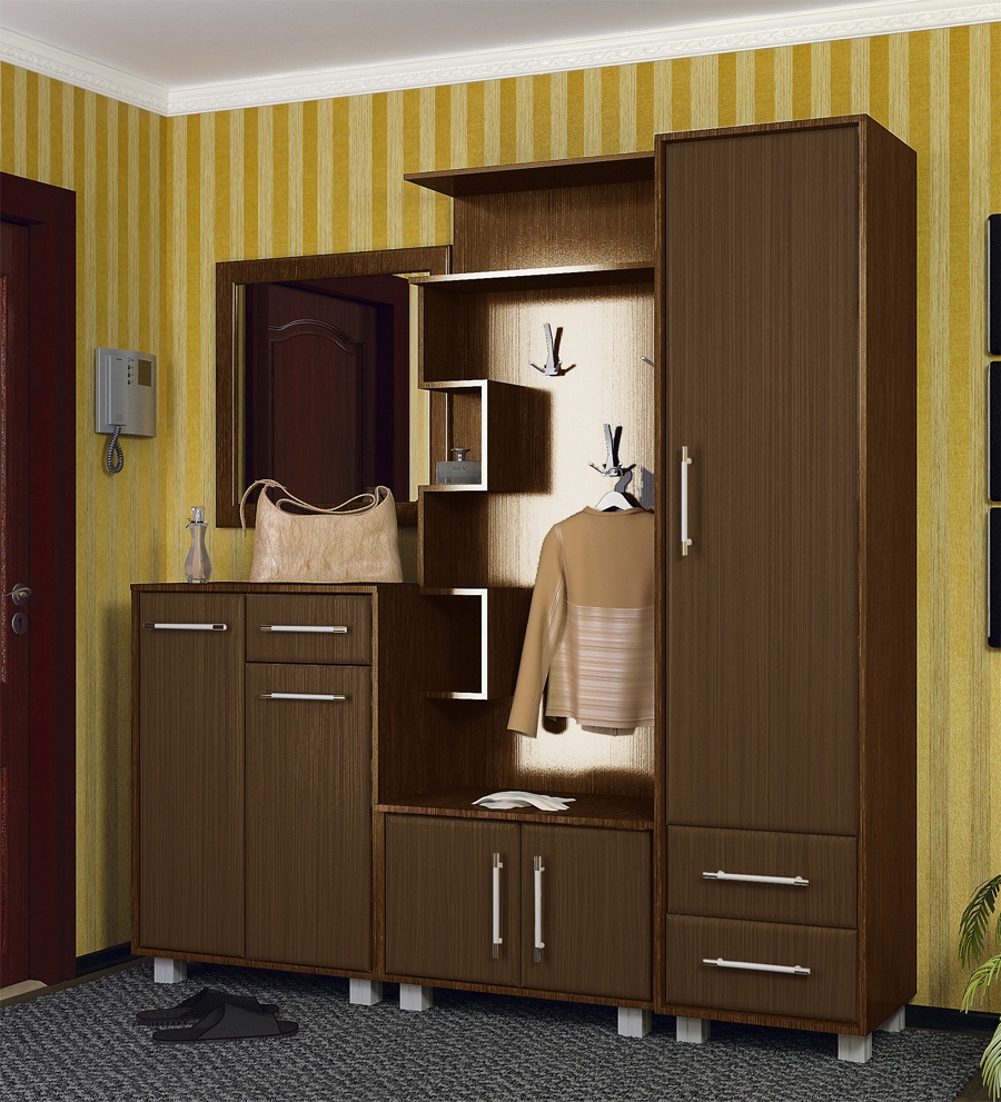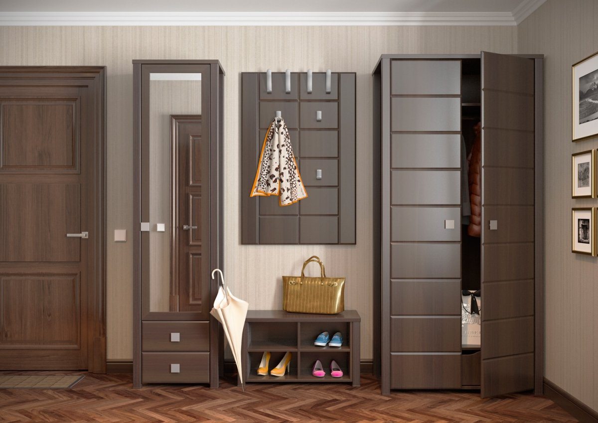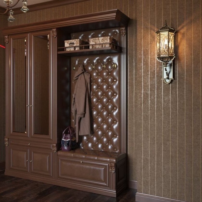 Per decorare il corridoio con colori scuri con stile classico puoi prestare attenzione al corridoio finito con un armadio e finiture in pelle in un nobile color noce. Il vantaggio dei corridoi già pronti è che sono multifunzionali, puoi anche riporre scarpe e altre cose al loro interno.
