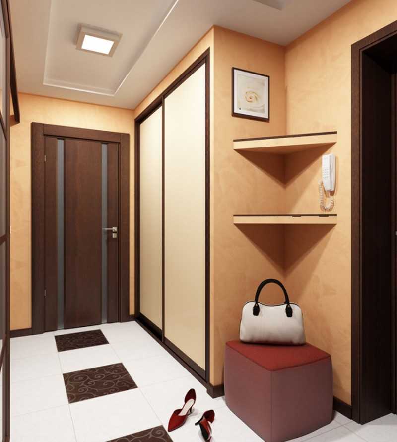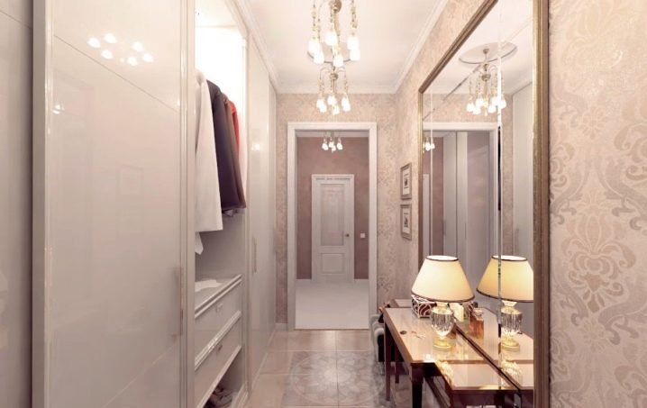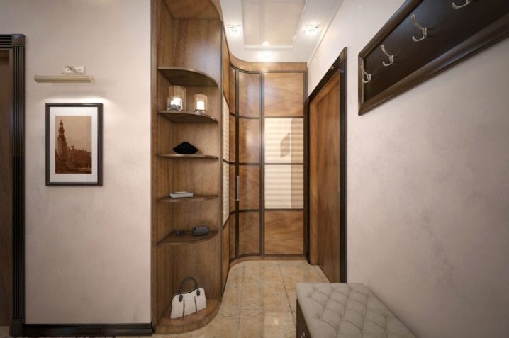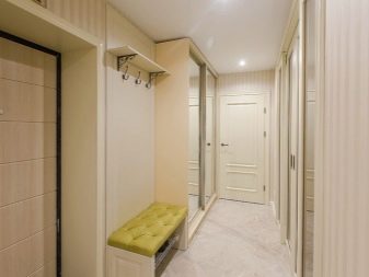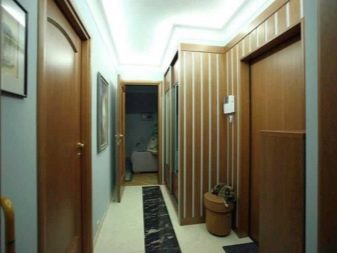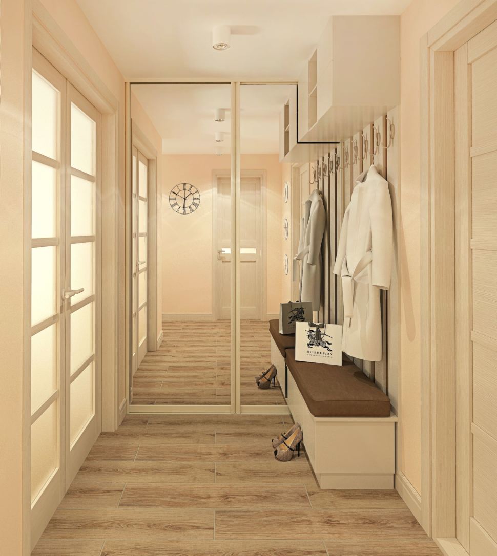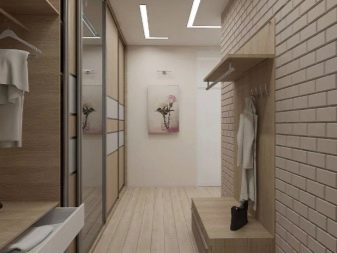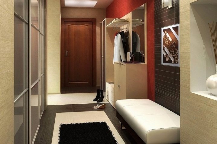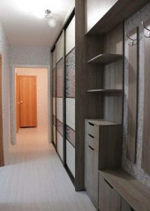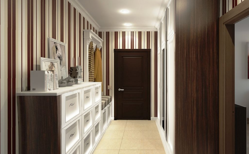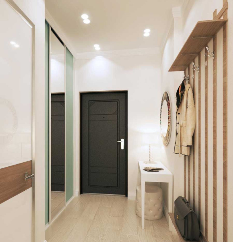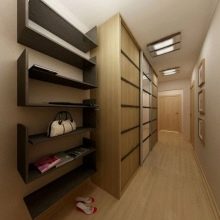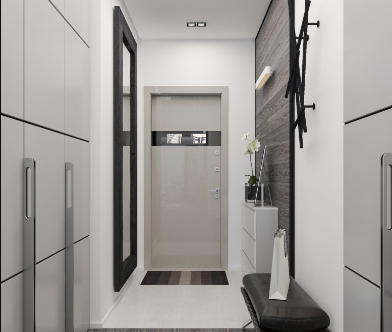 Se nei corridoi quadrati è possibile scegliere dove posizionare l'armadio, nei corridoi rettangolari può avvenire solo lungo il lungo muro all'ingresso del soggiorno. Una scarpiera e un appendiabiti saranno posizionati proprio davanti alla porta.