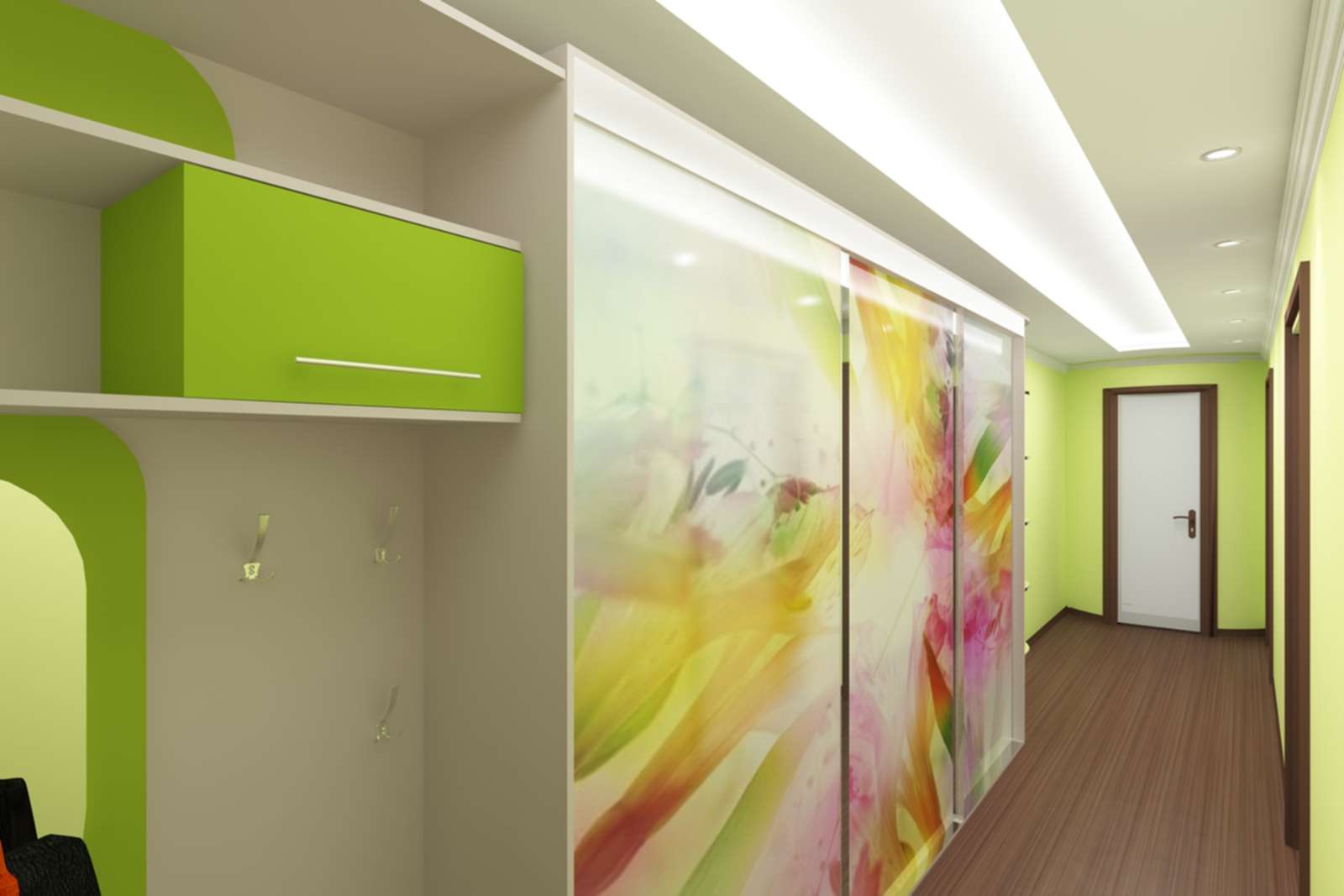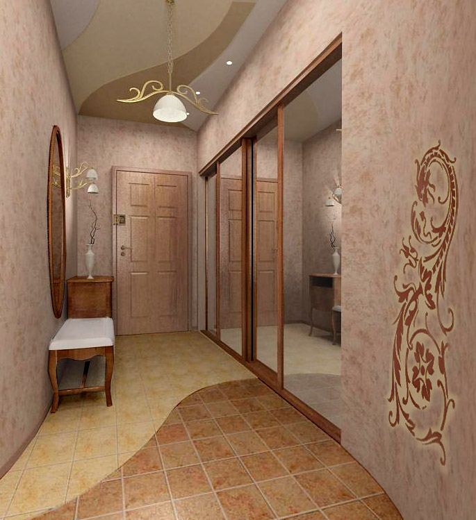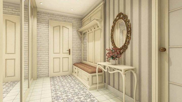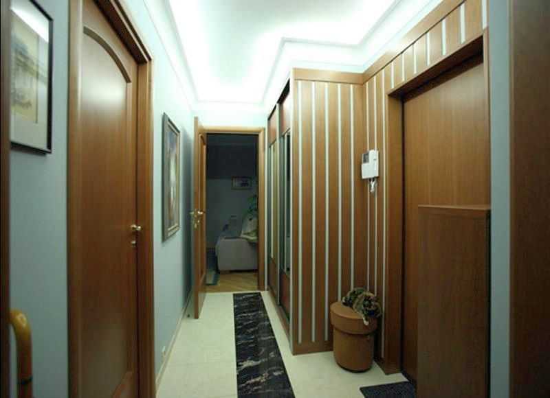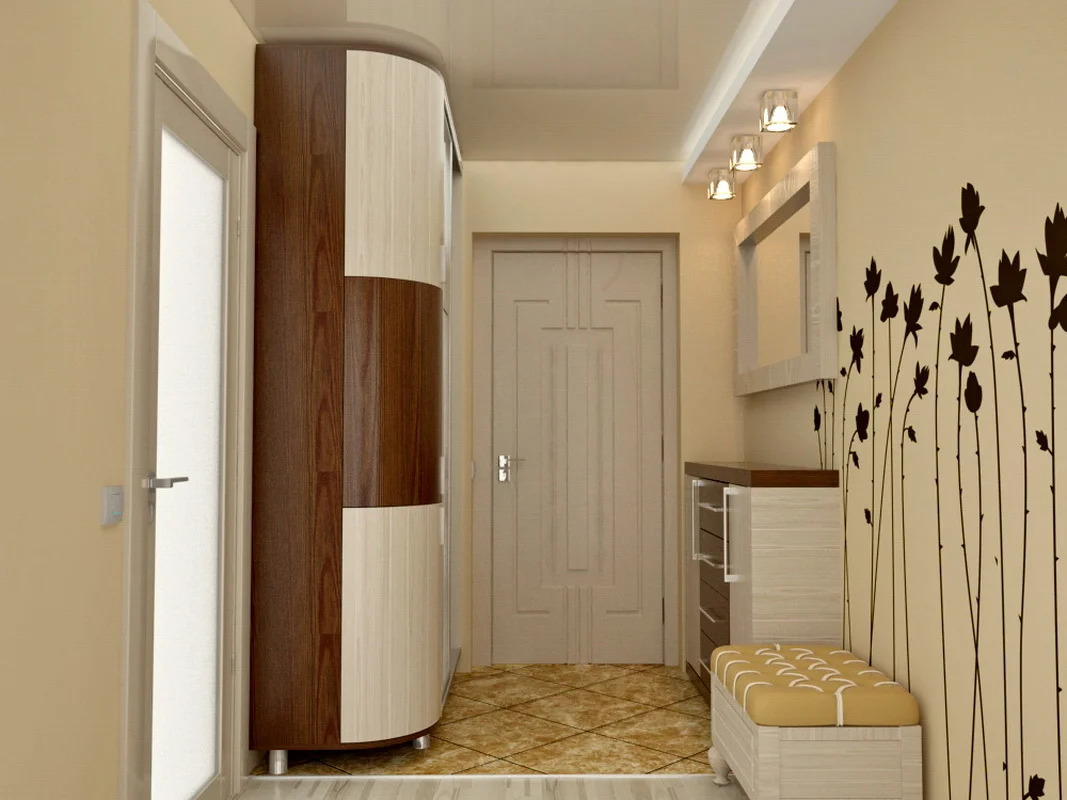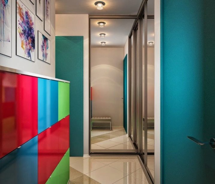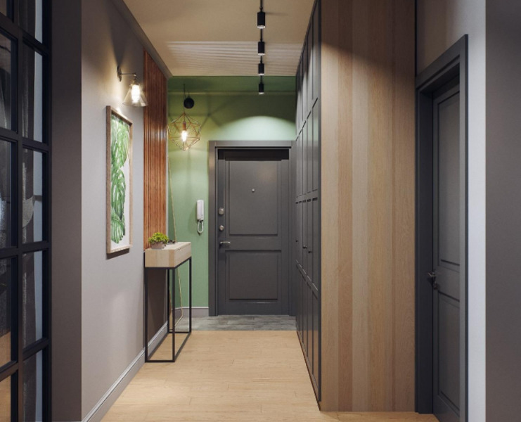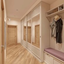 Se nei corridoi quadrati è possibile scegliere dove posizionare l'armadio, nei corridoi rettangolari può avvenire solo lungo il lungo muro all'ingresso del soggiorno. Una scarpiera e un appendiabiti saranno posizionati proprio davanti alla porta.