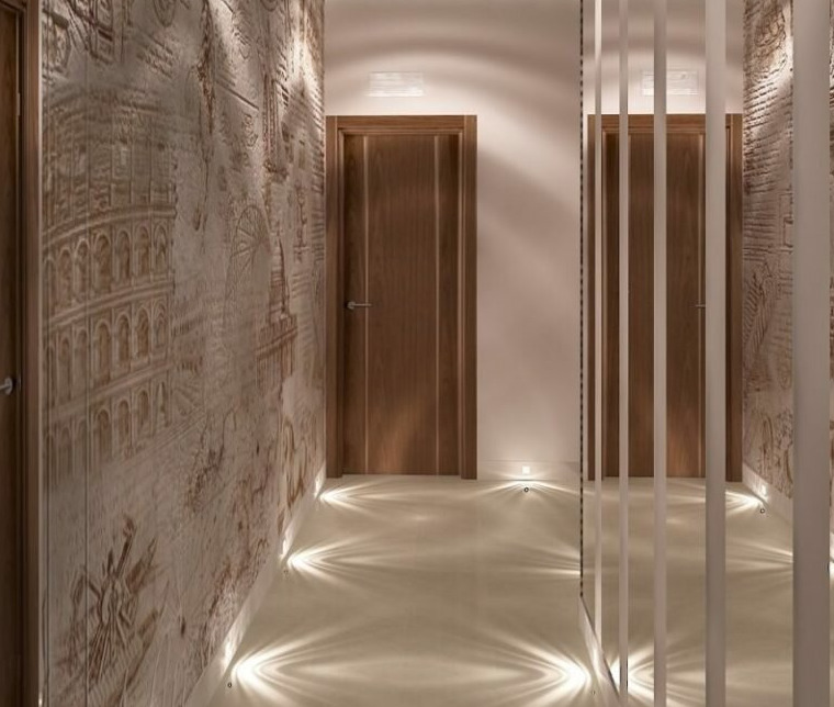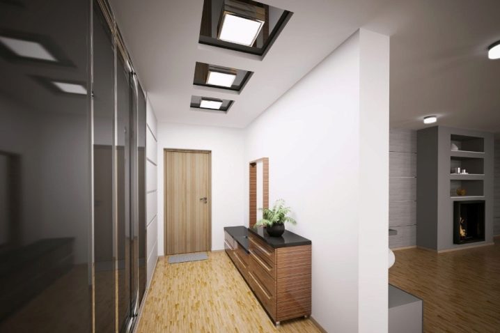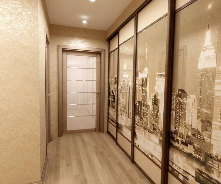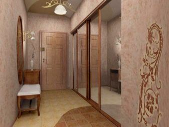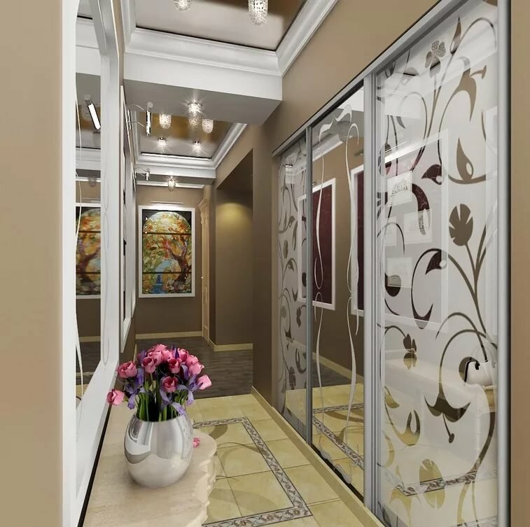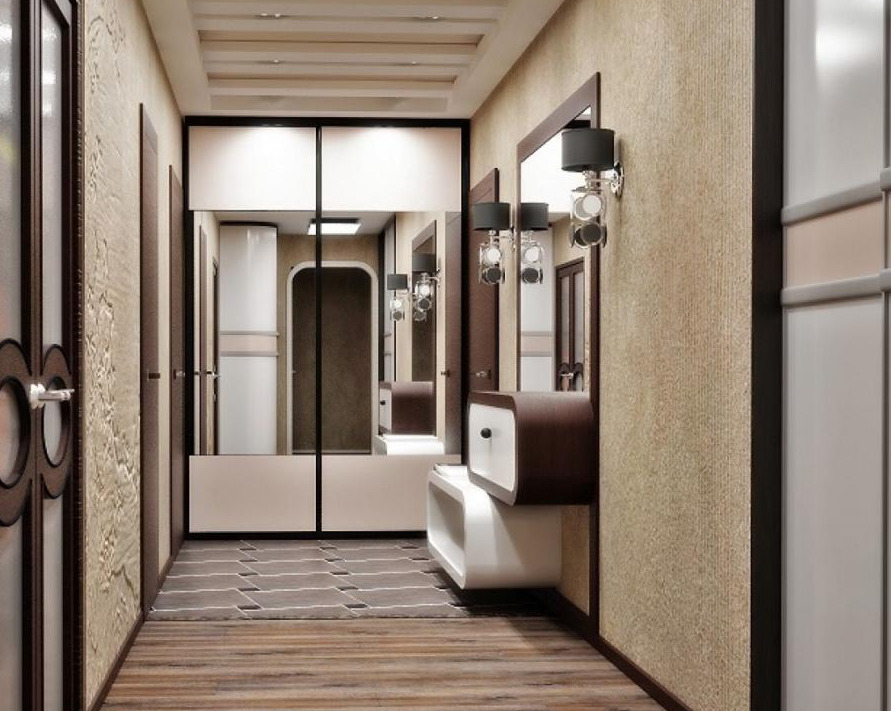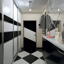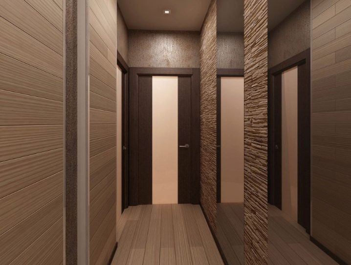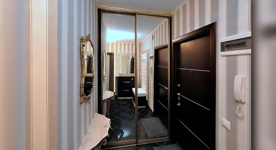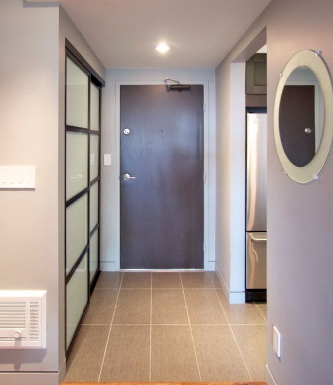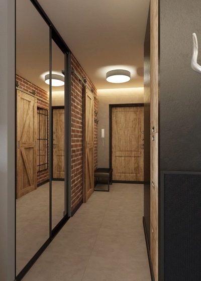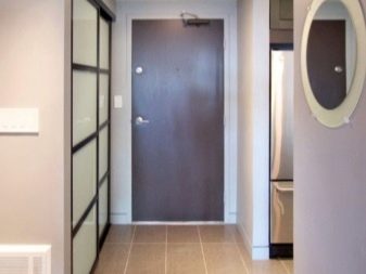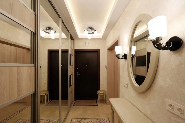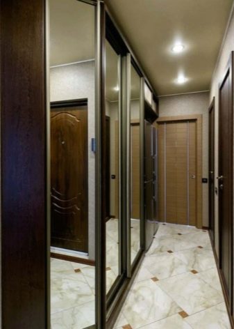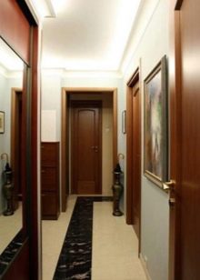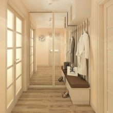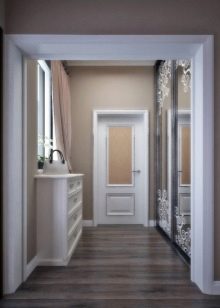 Per i corridoi stretti, la riflettività delle ante gioca un ruolo importante. Se almeno una porta è specchiata, non solo migliorerà visivamente lo spazio, ma diventerà anche un elemento pratico del corridoio.