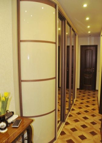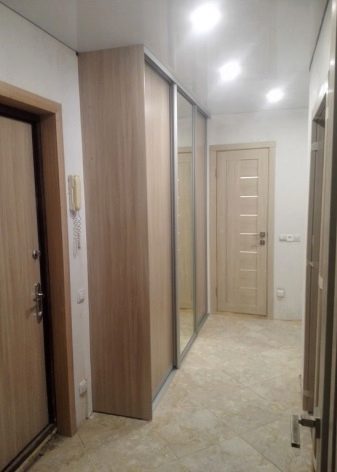 Il laconicismo del mobile, costruito sotto il soffitto, dal design minimal, è in linea con lo stile moderno. Una struttura che occupa quasi l'intero spazio della parete può liberare il corridoio da antiestetici riempimenti con appendiabiti aperti. Non è difficile, venendo dalla strada, aprire la porta e appendere la giacca nell'armadio. Lì non raccoglierà polvere e non rovinerà il design del corridoio con il suo aspetto.