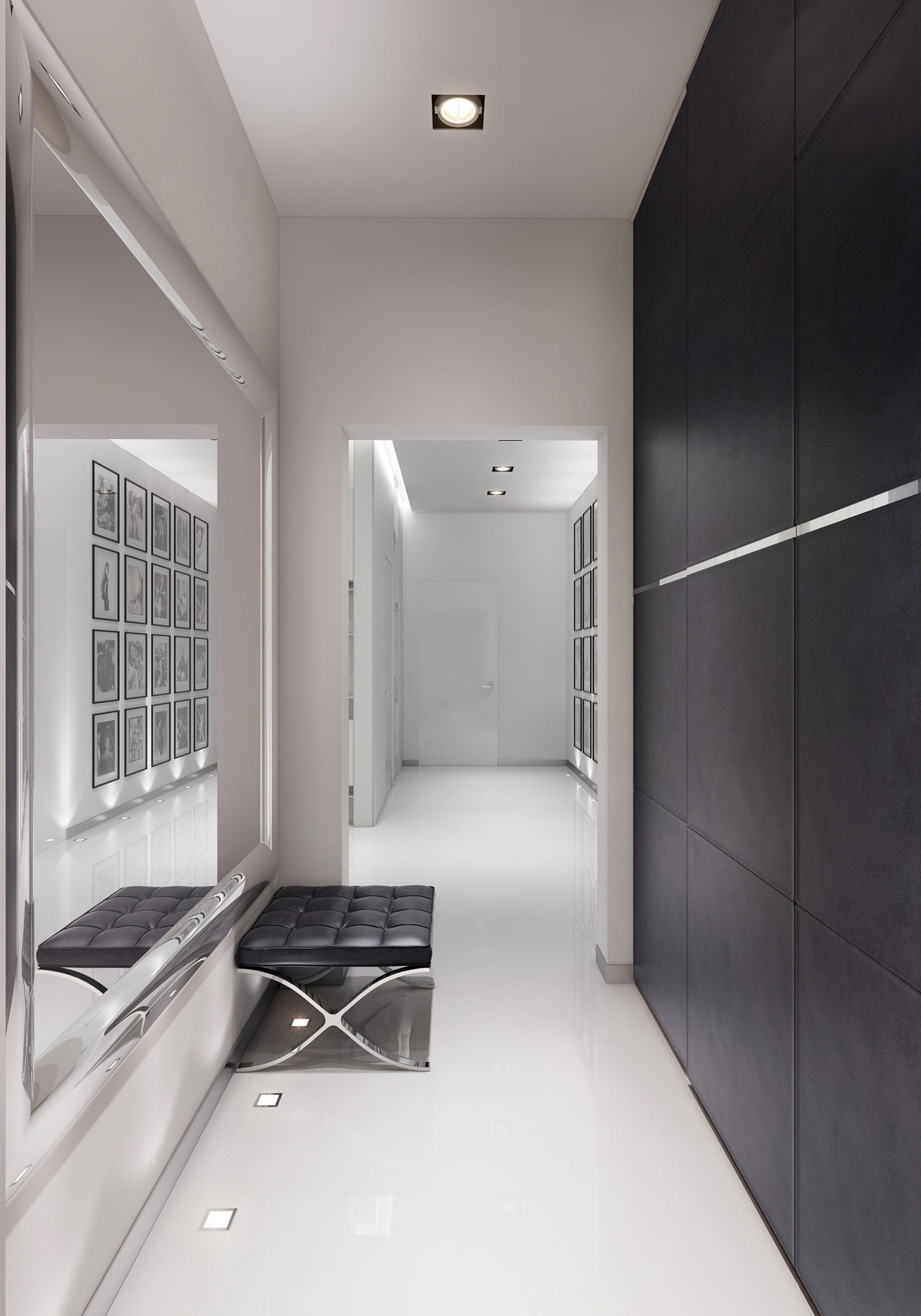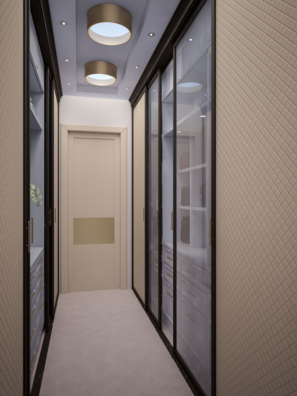 Design efficace di corridoi stretti con armadi nello stile del minimalismo.