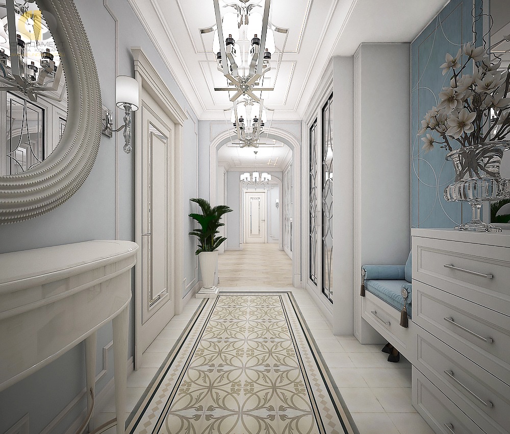 Il lungo e allo stesso tempo capiente corridoio in stile classico, oltre a uno stravagante guardaroba, contiene altre tipologie di mobili.