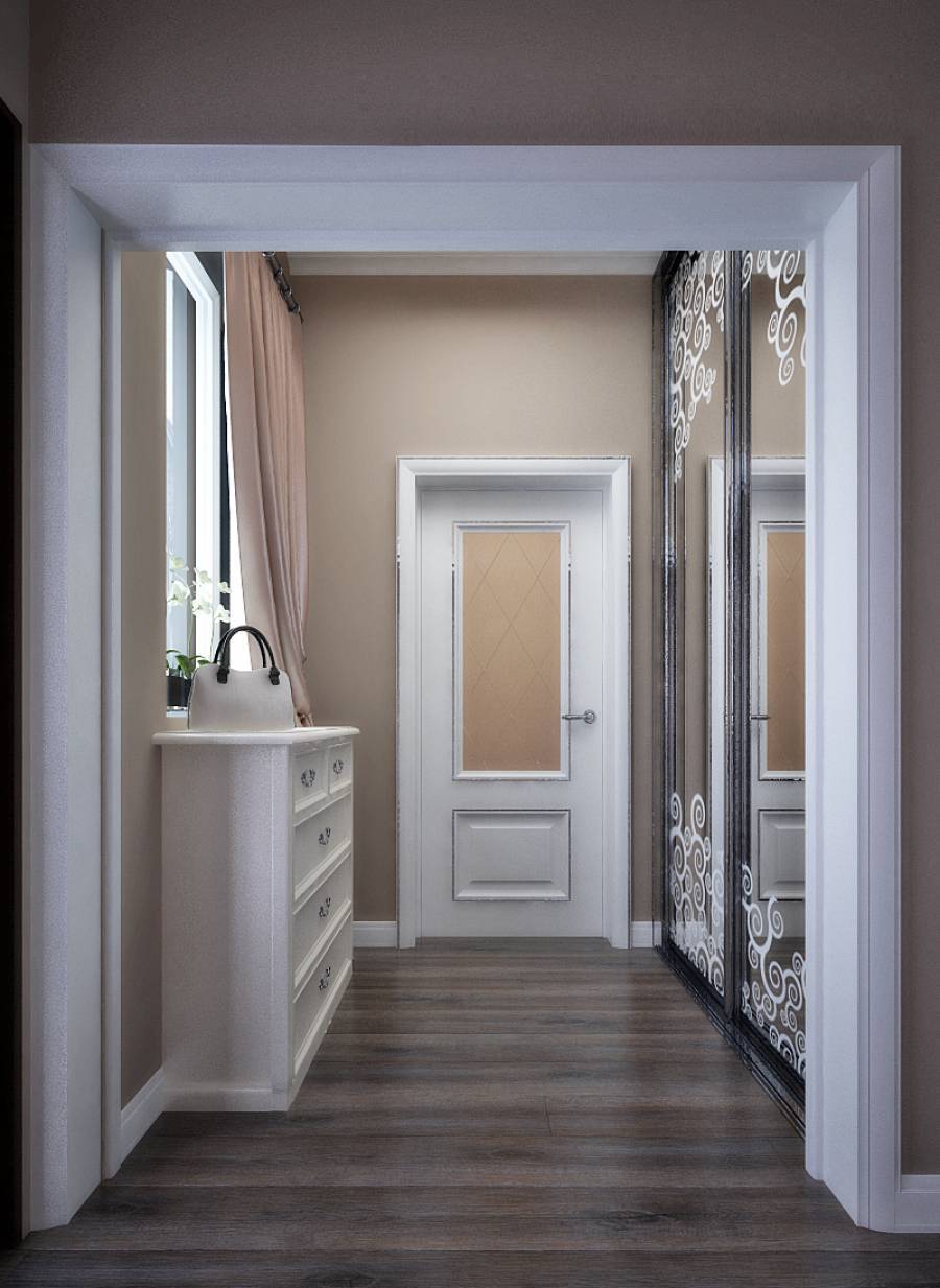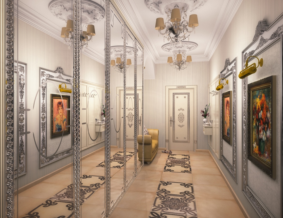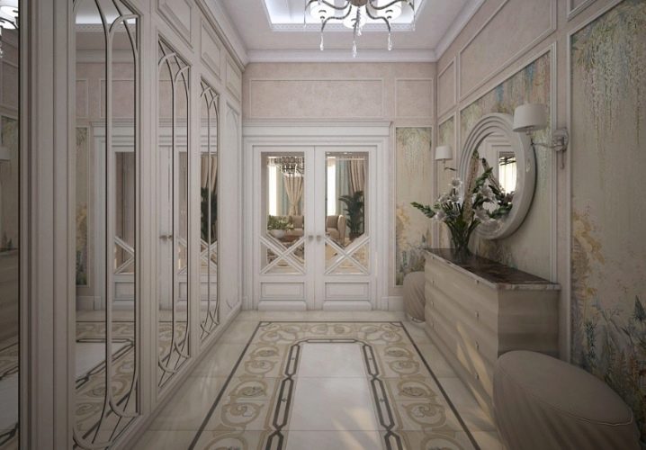 - Un altro esempio di classicismo è la sala d'ingresso, che si riflette nelle facciate a specchio di un elegante armadio.