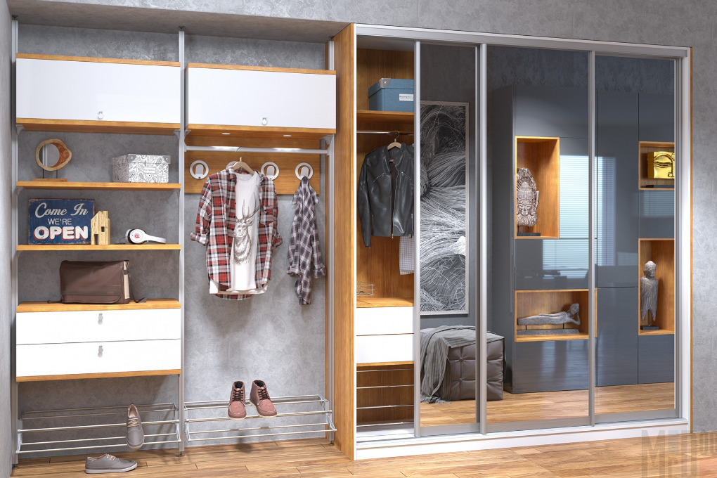 Gli armadi scorrevoli possono essere classificati in base all'aspetto delle facciate, ai meccanismi di scorrimento, alla forma, alla posizione. Diversi tipi di armadi sono adatti per corridoi stretti.