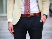 Un tale prodotto è considerato classico ed è spesso realizzato in vera pelle. La larghezza della cintura dei pantaloni è di 3 centimetri. Per quanto riguarda la fibbia, ha una forma rettangolare. Le decorazioni non sono fornite qui. Un'elegante cintura per pantaloni dovrebbe essere in armonia con l'abito scelto e non risaltare sullo sfondo. La sua combinazione di colori è piuttosto varia, quindi il colore del prodotto può essere nero, blu e persino bordeaux.