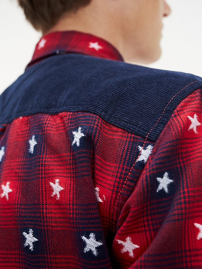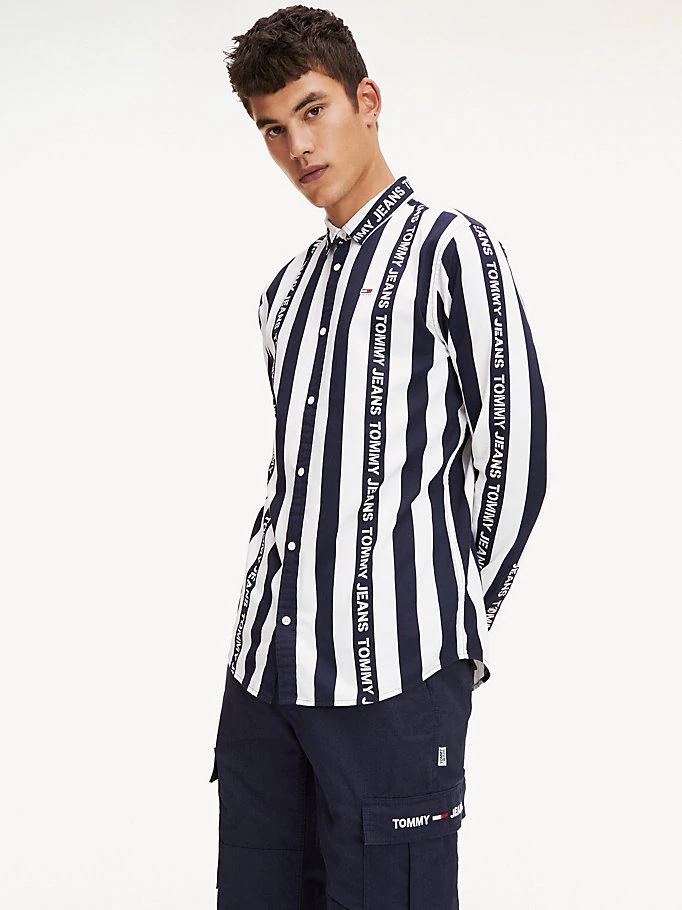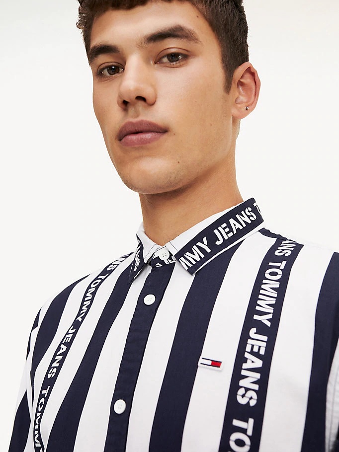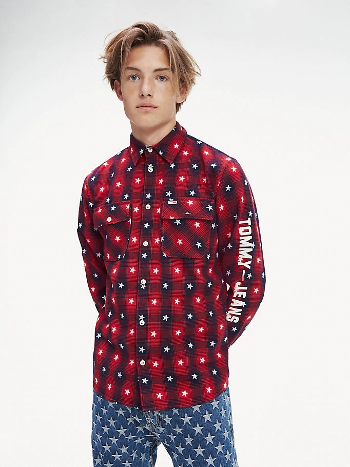 Un interessante modello grigio con strisce a contrasto di rosso e bianco. Le stelle bianche su sfondo rosso e blu sono un'altra opzione audace e straordinaria. Non ti farà passare inosservata nemmeno una camicia a righe larghe bianco-nere e gli slogan Tommy Jeans. Se segui da vicino le tendenze della moda, puoi acquistare un modello con una stampa floreale.