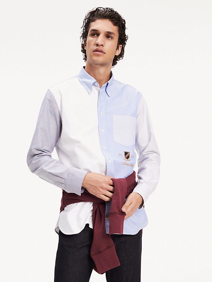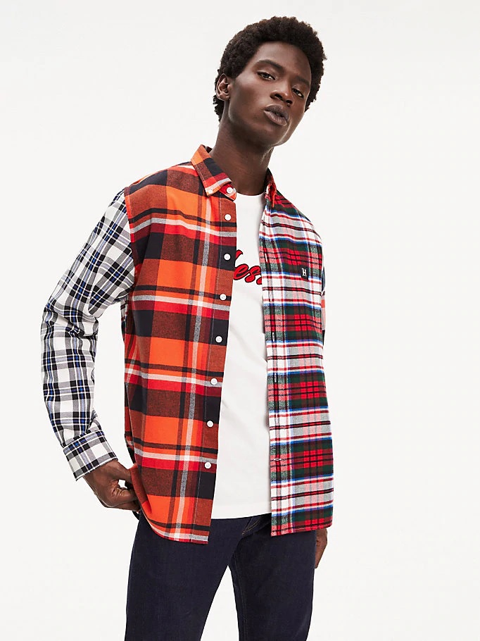 Ad esempio, un modello a scacchi sembra insolito dalla collezione dell'autore di Lewis Hamilton per Tommy Hilfiger. Il prodotto sembra composto da più magliette. Ogni elemento ha le proprie dimensioni di cella e combinazione di colori.