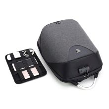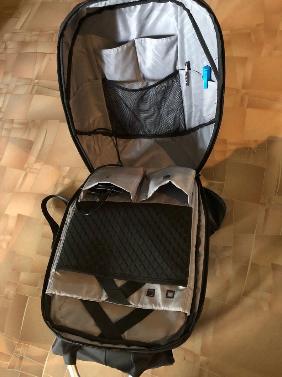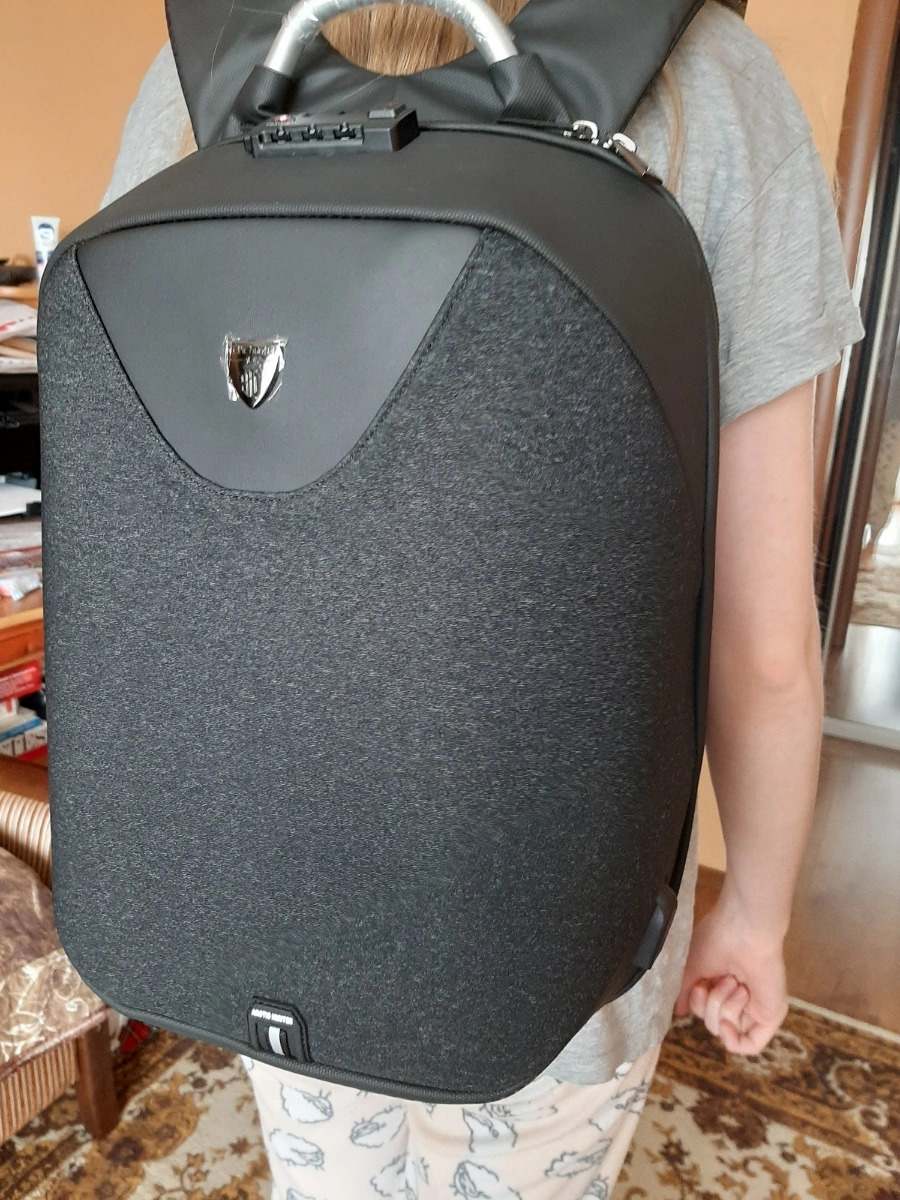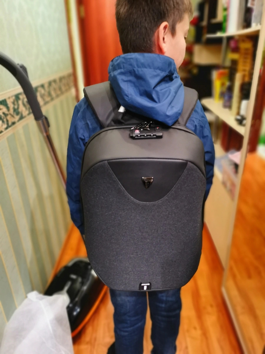La tasca dell'acqua in rete laterale è dotata di cinghie su entrambi i lati per una vestibilità sicura. Il penultimo scomparto ha un gran numero di scomparti in cui possono essere riposti telefoni, penne, taccuini e cuffie. Fondamentalmente, la tasca frontale può ospitare oggetti più grandi: quaderni a grandezza naturale, astucci, contenitori piatti per alimenti e molto altro. Lo scomparto più lontano e anche il più grande è progettato per laptop, tablet e libri da 15,6 pollici. C'è una tasca nascosta lungo la schiena, coperta da una linea di poliestere. Potrebbe sembrare un semplice elemento di design, ma dietro c'è uno scomparto pensato per nascondere ai rapitori oggetti particolarmente importanti.