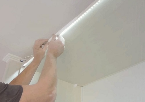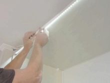 - Utilizzo di profili speciali. È prevista l'installazione del nastro nello spazio tra il soffitto teso e le pareti.
