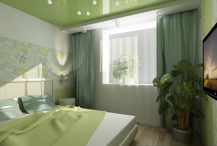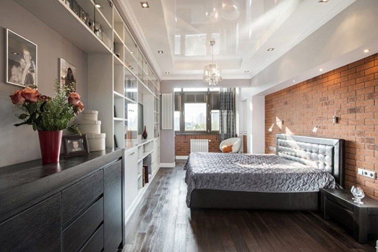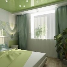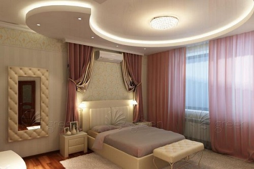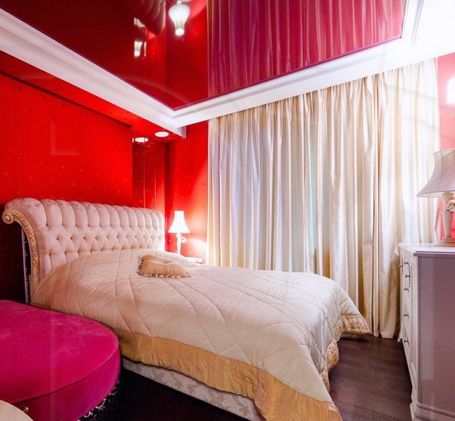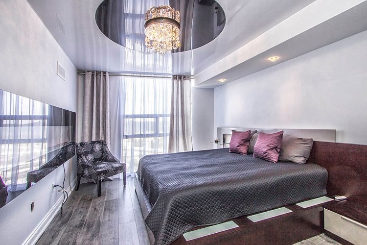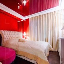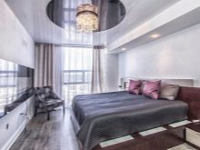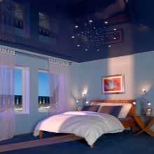 Infine, resta da considerare varie varianti del design dell'illuminazione della camera da letto, determinate dalle caratteristiche del soffitto teso. Ecco alcuni esempi di tele lucide:
