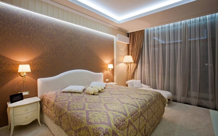 - applique su entrambi i lati del letto, faretti - lungo il perimetro del soffitto;