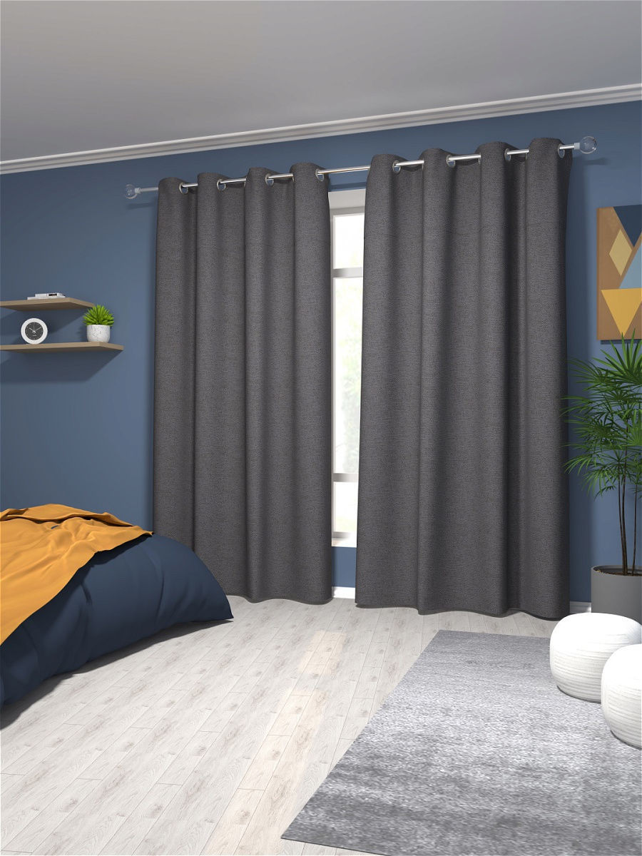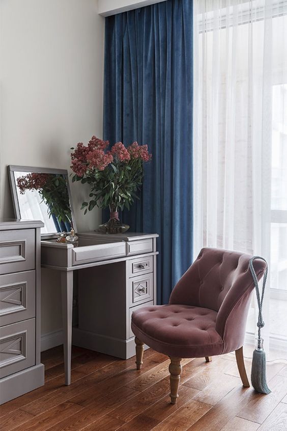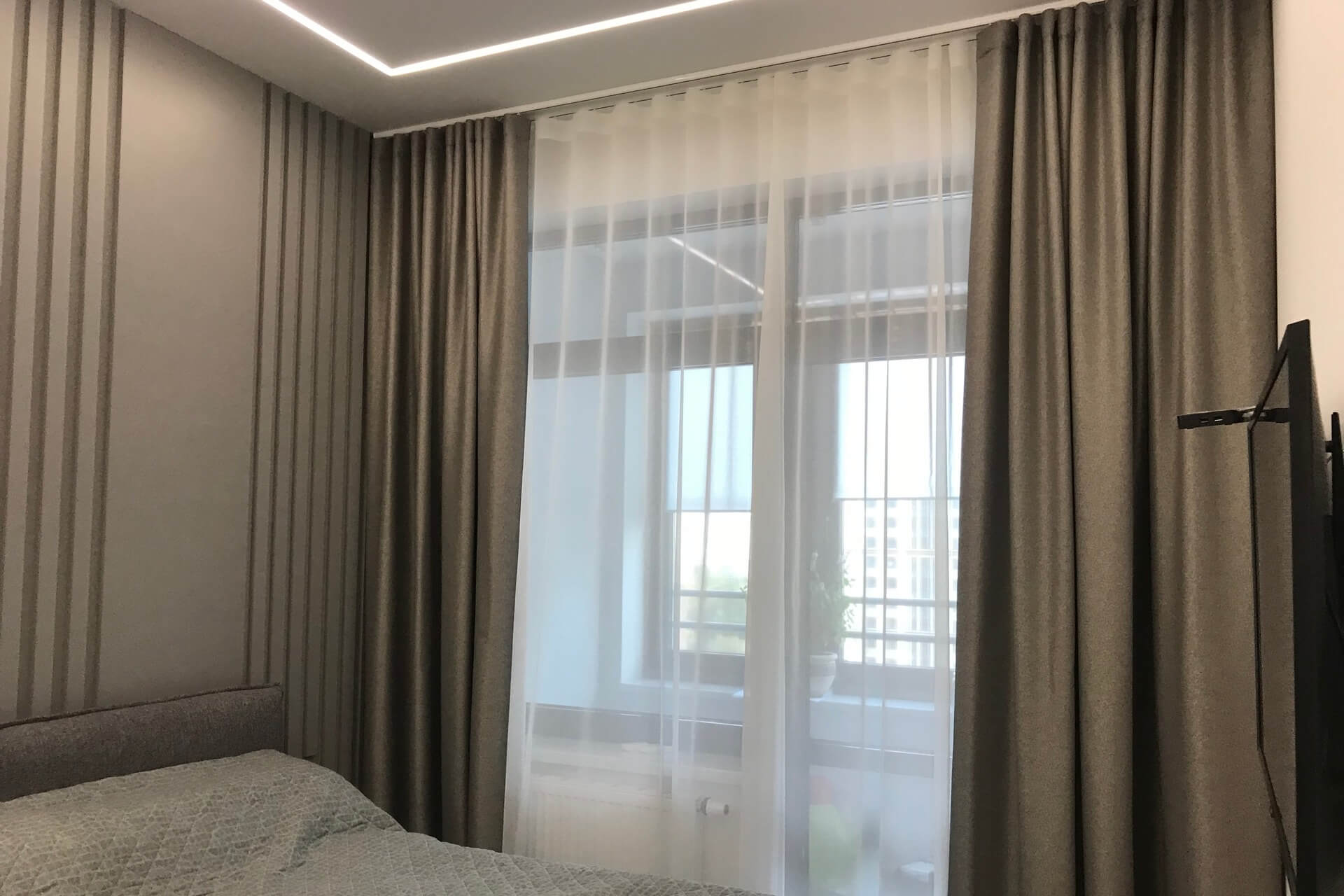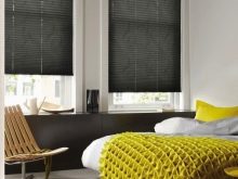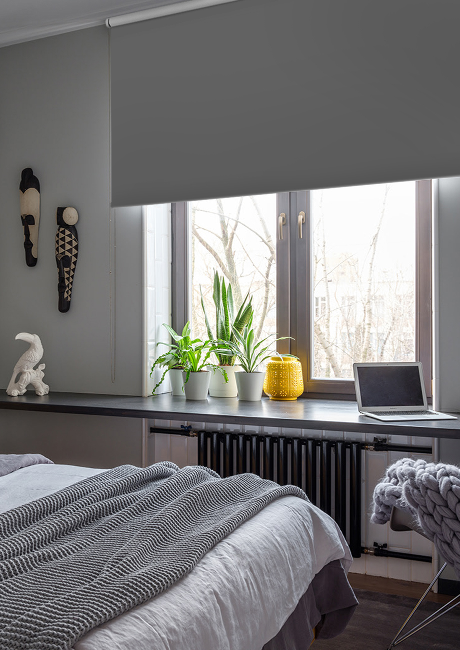 - le opzioni testurizzate nere per l'arredamento delle finestre sono adatte per una camera da letto combinata con un ufficio.