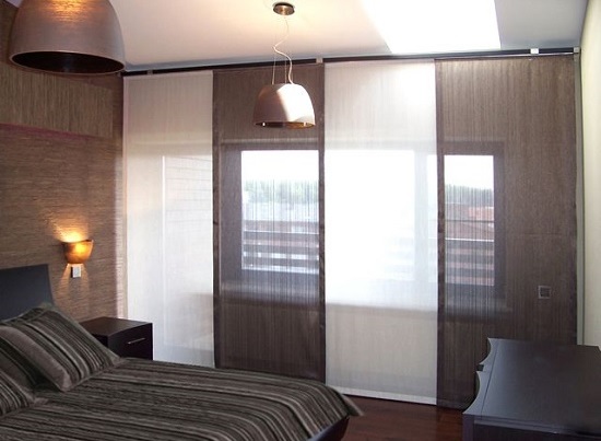 - Giapponese. Più simili a uno schermo, i pannelli lisci sono fissati sui binari del soffitto e sugli incontri a pavimento. Si adattano bene agli interni minimalisti e hanno vari gradi di trasmissione della luce.