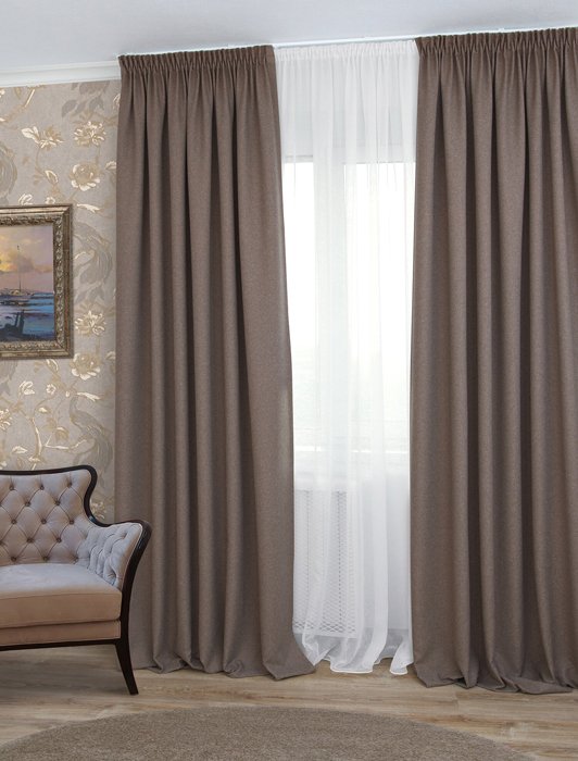 - Tende classiche di tonalità caramello con drappeggi si fondono armoniosamente con la decorazione della camera da letto nei toni del cioccolato. Le morbide pieghe del materiale ingannano: il grado di ombreggiatura che fornisce ti consente di dormire sonni tranquilli anche in un pomeriggio limpido.