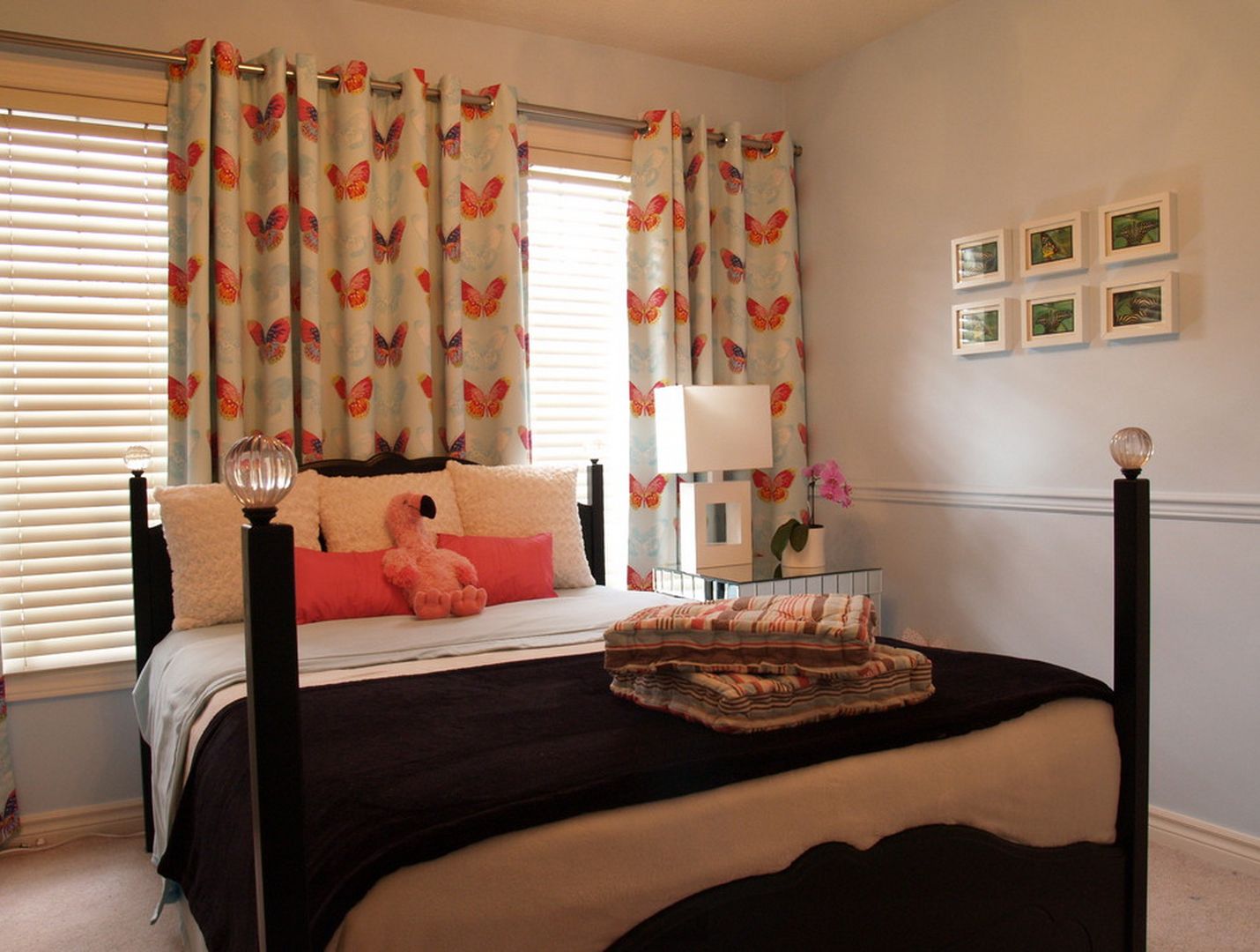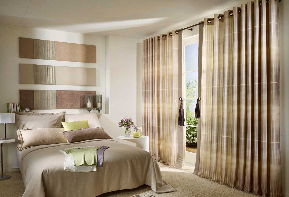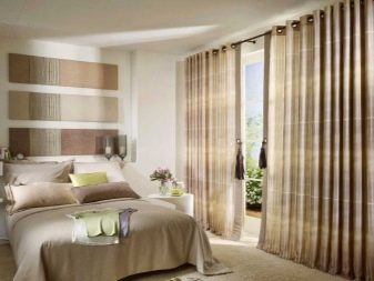 Le tende con occhielli nella camera da letto conferiscono alla stanza un aspetto sofisticato ed elegante e allo stesso tempo laconicismo e semplicità. Ci sono molte opzioni per combinare forme, trame e sfumature.