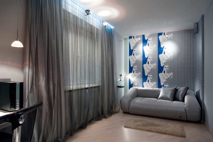 - Per l'avanguardia, i contrasti creativi e la geometria della linea non convenzionale saranno appropriati. Tuttavia, sono adatte anche tende semplici sugli occhielli lunghi fino al pavimento: diventeranno lo sfondo del resto dei dettagli luminosi.