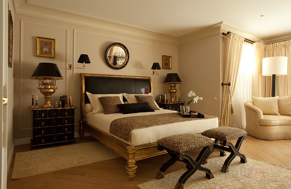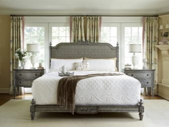 Lo stile americano presuppone un'ambientazione di mobili di grandi dimensioni, in particolare il letto - questo è il tratto dominante della camera da letto, attorno alla quale il resto degli elementi, spesso appartenenti alla stessa collezione, sono costruiti in un'unica combinazione di colori. La testiera va presa sul serio, l'utilizzo di legni pregiati per gli intagli è l'ideale. Se il letto è in metallo, la testiera può essere forgiata. In ogni caso meglio un materasso alto.