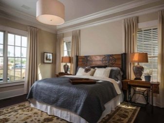 Scegliendo l'arredamento della camera da letto in stile americano, i proprietari sono guidati solo dalle proprie preferenze e gusti. Elementi tessili realizzati in tessuto naturale denso, taglio semplice, il letto può essere realizzato con un copriletto o una coperta di lana. Gli accenti di colore sono possibili sotto forma di pannelli a parete, cuscini, realizzati in stili patchwork (cucitura patchwork).