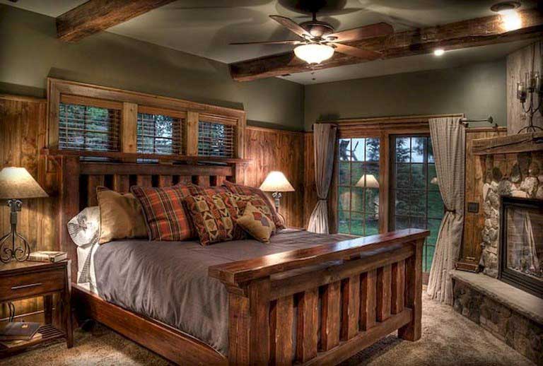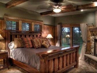 La stanza in stile country americano prevede l'uso del legno naturale nella decorazione di pareti, pavimenti e soffitti sotto forma di pannelli, travi del soffitto. Pareti, solide o con un piccolo motivo floreale, mobili rifiniti in pelle.
