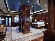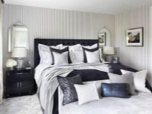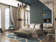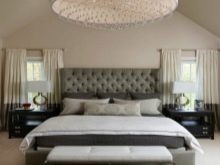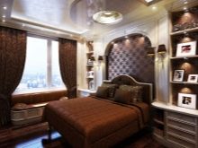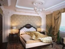 Per creare la verticale necessaria nella camera da letto, equipaggiano colonne o sporgenze. Questa soluzione consente di alzare visivamente il soffitto e conferire così all'arredamento un "gusto" speciale. Le linee orizzontali sono create da sottili bordi in gesso o legno sopra la testiera. Le nicchie ad arco sono benvenute.