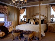 In conclusione, notiamo che lo stile classico può essere ricreato in una piccola camera da letto, sebbene ciò non sia facile. In questo caso, dovrai abbandonare tutti gli elementi non necessari e concentrarti sull'ingombrante letto a baldacchino. I comodini dovrebbero essere posizionati su entrambi i lati, le graziose applique dovrebbero essere fissate sopra di loro. Una poltrona antica nell'angolo e una lampada da terra con un accogliente paralume stanno bene. Se lo spazio lo consente, una piccola toletta con un grande specchio in una cornice dorata può essere posizionata in un angolo vicino.