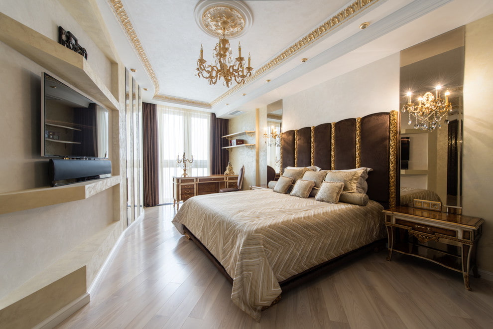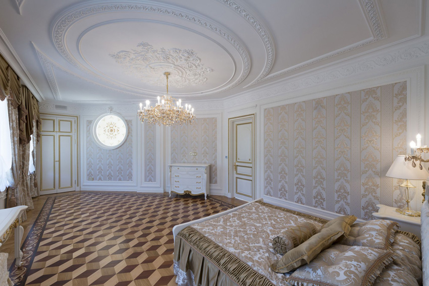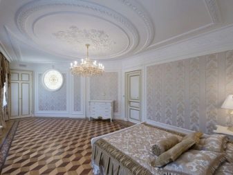 La base degli interni classici è il rivestimento di soffitti, pareti e pavimenti. Tutte le superfici verticali e orizzontali dovrebbero essere perfettamente lisce e uniformi, poiché solo su uno sfondo pulito è possibile creare una camera da letto lussuosa. Quando si decorano i locali, si dovrebbe dare la preferenza a materiali naturali di alta qualità: il loro costo si giustificherà pienamente con una lunga risorsa operativa e caratteristiche decorative eccezionali.