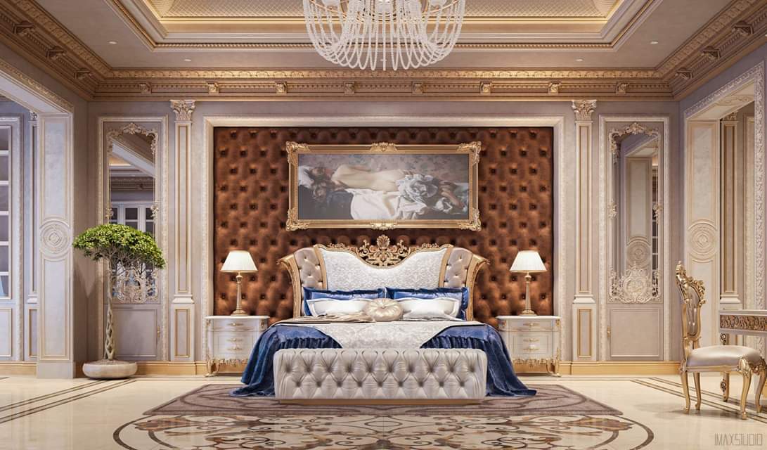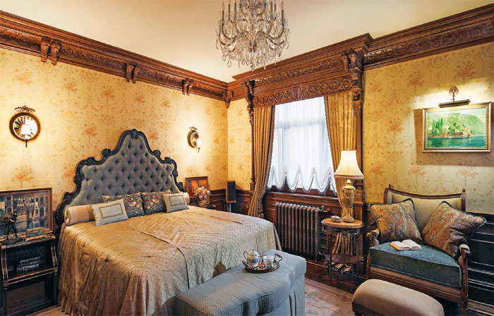 Incisioni in lussuose cornici massicce, così come tele di artisti classici, si inseriscono armoniosamente all'interno della camera da letto. Mosaici, dipinti artistici, pannelli decorativi e affreschi sono spettacolari.