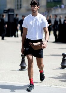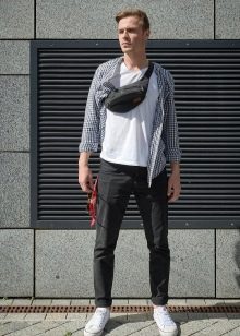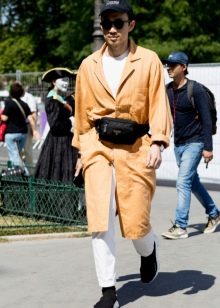 Vari attacchi e cinghie consentono a un uomo di indossare una banana sulla cintura, sulla spalla o sui fianchi. Un'opzione interessante sono gli accessori per cintura con fissaggio sia sulla cintura che sulla gamba. In inverno, una borsa sopra un piumino allungato completerà con stile il look. Le banane funzionano bene anche con giacche corte aperte.