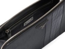 La pochette da uomo con placca, dove si trova il simbolismo del marchio, è chiusa con una cerniera nella parte superiore. E' presente uno scomparto interno, una maniglia per indossare il prodotto al polso. Questa pochette in pelle saffiano si chiude con una zip superiore.